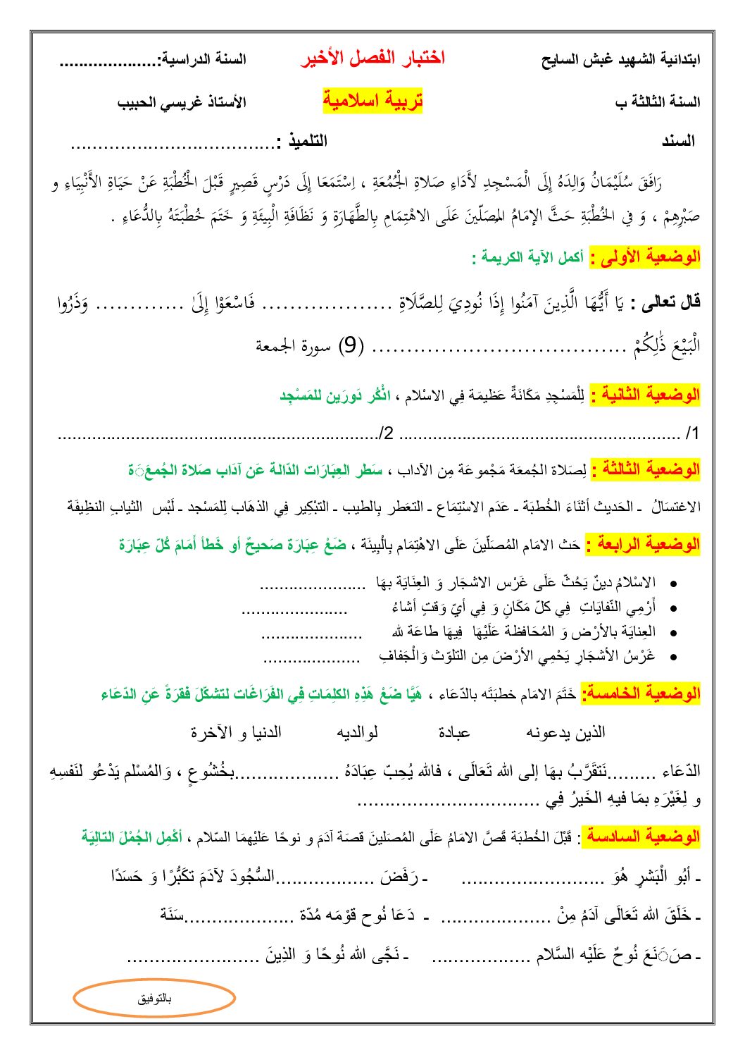 مادة التربية الإسلامية للسنة الثالثة ابتدائي : نموذج لإمتحان في الفصل الثالث رقم 28- في مادة الإسلامية مستوى السنة الثالثة ابتدائي الجيل الثاني ، السنة الدراسية: 2025/2026 مع التصحيح