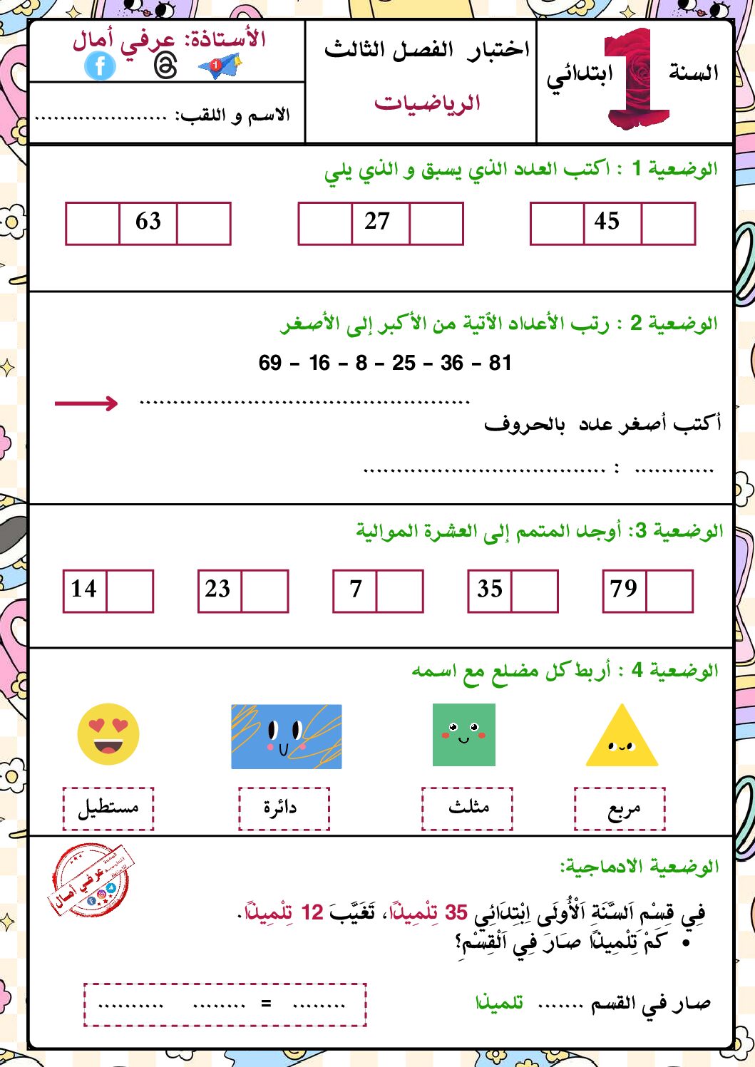 إختبار الفصل الثالث في الرياضيات السنة الأولى ابتدائي رقم 54
