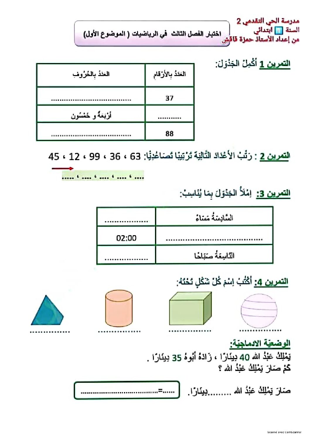 إختبار الفصل الثالث في الرياضيات السنة الأولى ابتدائي رقم 57