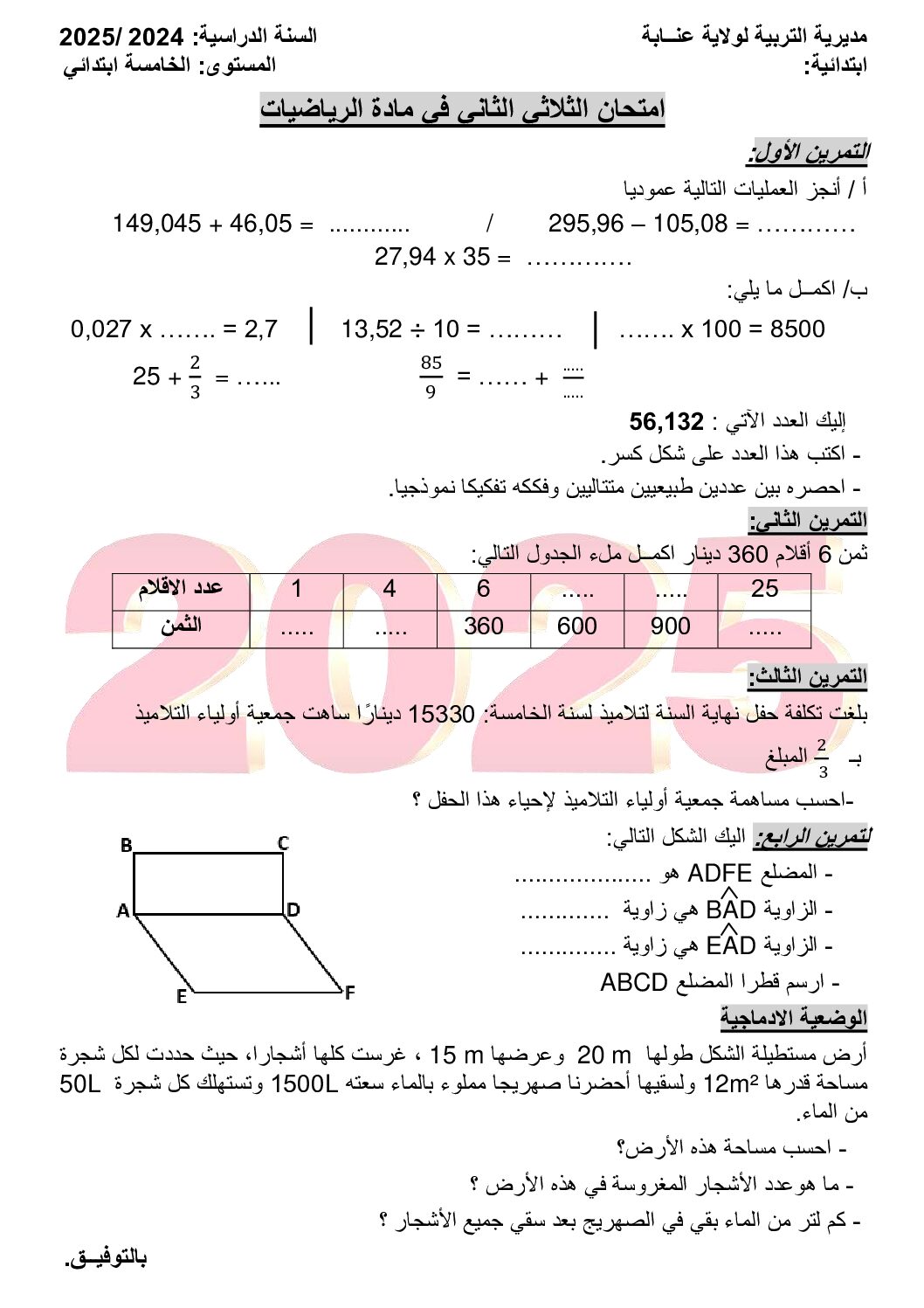 مادة الرياضيات للسنة الخامسة 5 ابتدائي دروس مفصلة، فروض واختبارات، تمارين محلولة : نموذج لإمتحان في الفصل الثاني رقم 122- في مادة الرياضيات مستوى السنة الخامسة ابتدائي الجيل الثاني ، السنة الدراسية: 2026/2027 مع التصحيح