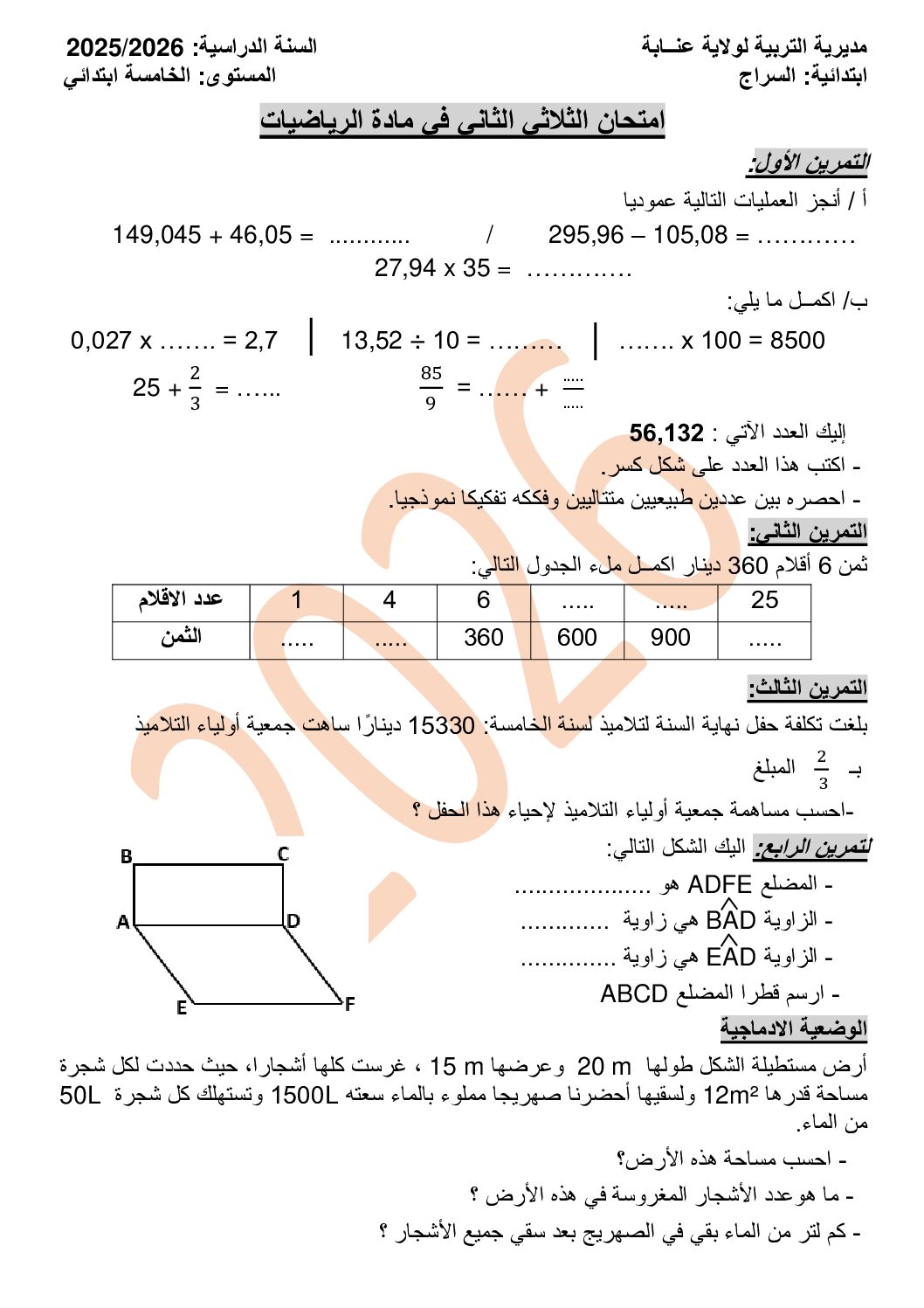 مادة الرياضيات للسنة الخامسة 5 ابتدائي دروس مفصلة، فروض واختبارات، تمارين محلولة : نموذج لإمتحان في الفصل الثاني رقم 127- في مادة الرياضيات مستوى السنة الخامسة ابتدائي الجيل الثاني ، السنة الدراسية: 2026/2027 مع التصحيح
