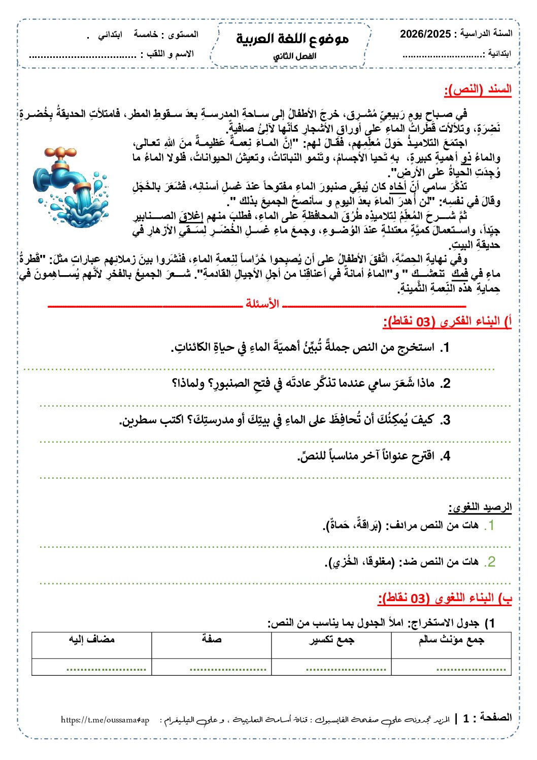 مادة اللغة العربية للسنة الخامسة 5 ابتدائي دروس مفصلة، فروض واختبارات، تمارين محلولة: نموذج لإمتحان في الفصل الثاني رقم 146- في مادة اللغة العربية مستوى السنة الخامسة ابتدائي الجيل الثاني ، السنة الدراسية: 2026/2027 مع التصحيح