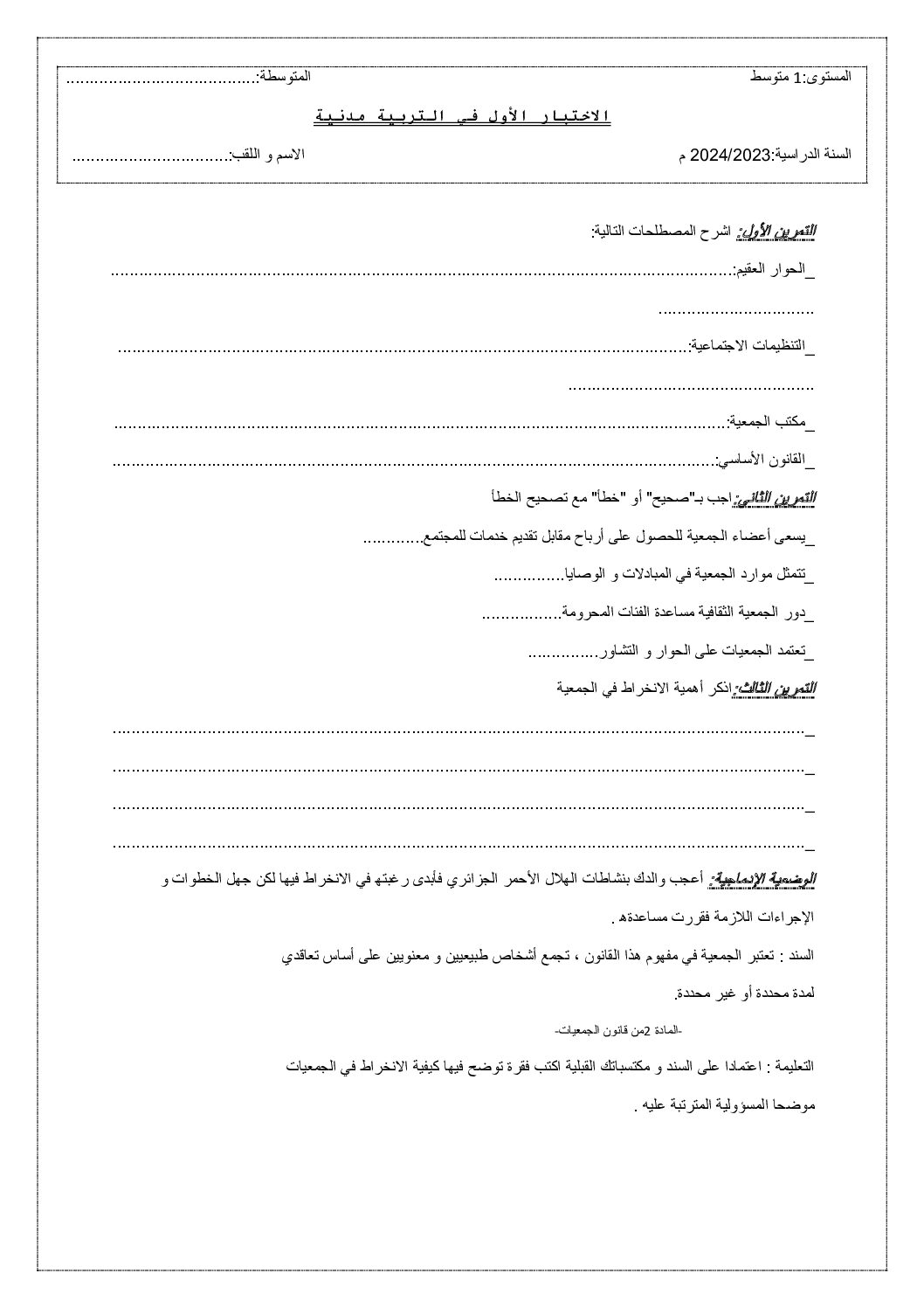 مادة التربية المدنية للسنة الأولى 1 متوسط دروس مفصلة، فروض واختبارات، تمارين محلولة: نموذج لإمتحان في الفصل الأول رقم 46- في مادة التربية المدنية مستوى السنة الأولى متوسط الجيل الثاني ، السنة الدراسية: 2025/2026 مع التصحيح