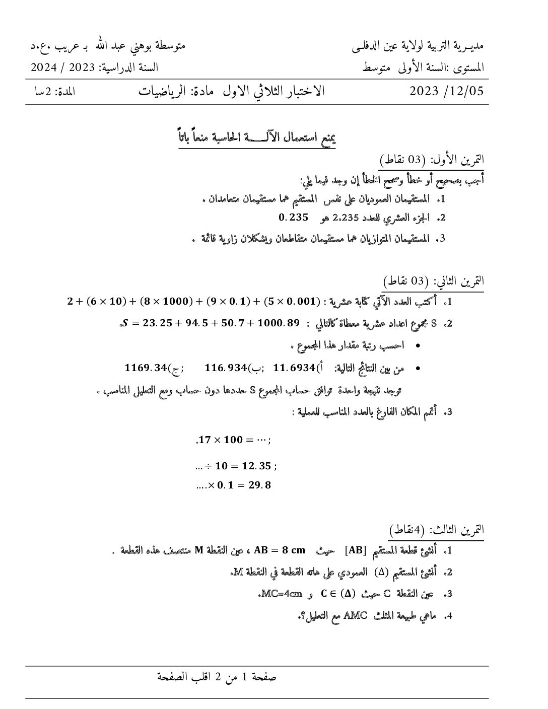 مادة الرياضيات للسنة الأولى 1 متوسط دروس مفصلة، فروض واختبارات، تمارين محلولة: نموذج لإمتحان في الفصل الأول رقم 82- في مادة الرياضيات مستوى السنة الأولى متوسط الجيل الثاني ، السنة الدراسية: 2025/2026 مع التصحيح