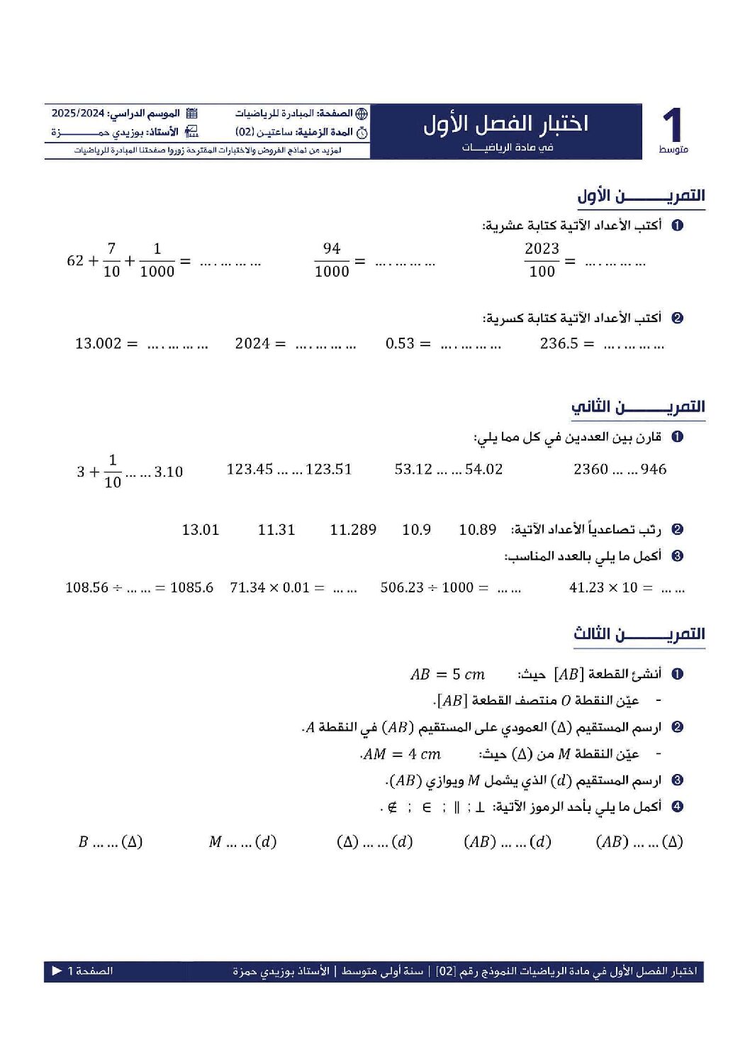 مادة الرياضيات للسنة الأولى 1 متوسط دروس مفصلة، فروض واختبارات، تمارين محلولة: نموذج لإمتحان في الفصل الأول رقم 89- في مادة الرياضيات مستوى السنة الأولى متوسط الجيل الثاني ، السنة الدراسية: 2025/2026 مع التصحيح