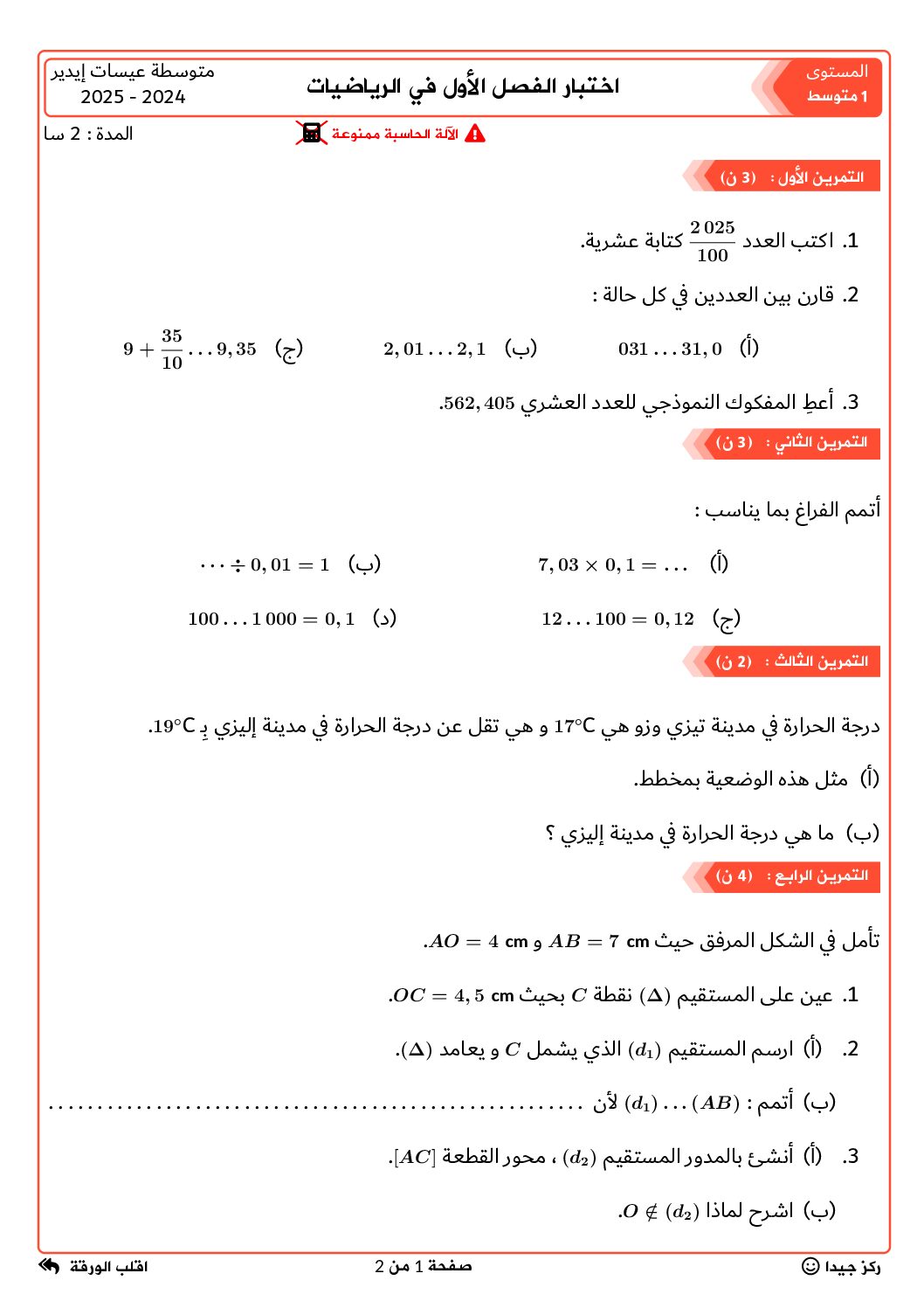 مادة الرياضيات للسنة الأولى 1 متوسط دروس مفصلة، فروض واختبارات، تمارين محلولة: نموذج لإمتحان في الفصل الأول رقم 91- في مادة الرياضيات مستوى السنة الأولى متوسط الجيل الثاني ، السنة الدراسية: 2025/2026 مع التصحيح