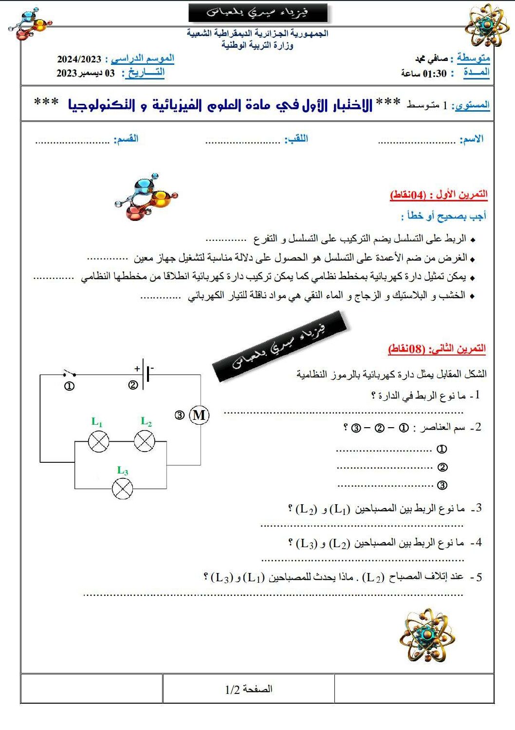 مادة العلوم الفيزيائية والتكنولوجيا للسنة الأولى 1 متوسط دروس مفصلة، فروض واختبارات، تمارين محلولة: نموذج لإمتحان في الفصل الأول رقم 76- في مادة العلوم الفيزيائية مستوى السنة الأولى متوسط الجيل الثاني ، السنة الدراسية: 2025/2026 مع التصحيح