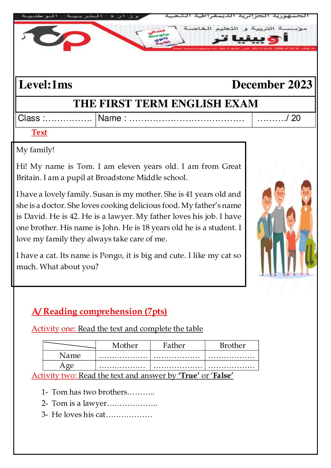 مادة اللغة الإنجليزية للسنة الأولى 1 متوسط دروس مفصلة، فروض واختبارات، تمارين محلولة: نموذج لإمتحان في الفصل الأول رقم 49- في مادة اللغة الإنجليزية مستوى السنة الأولى متوسط الجيل الثاني ، السنة الدراسية: 2025/2026 مع التصحيح