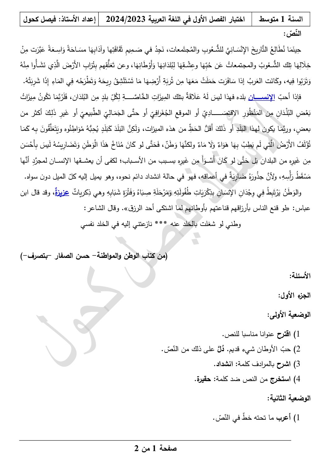 مادة اللغة العربية للسنة الأولى 1 متوسط دروس مفصلة، فروض واختبارات، تمارين محلولة: نموذج لإمتحان في الفصل الأول رقم 57- في مادة اللغة العربية مستوى السنة الأولى متوسط الجيل الثاني ، السنة الدراسية: 2025/2026 مع التصحيح