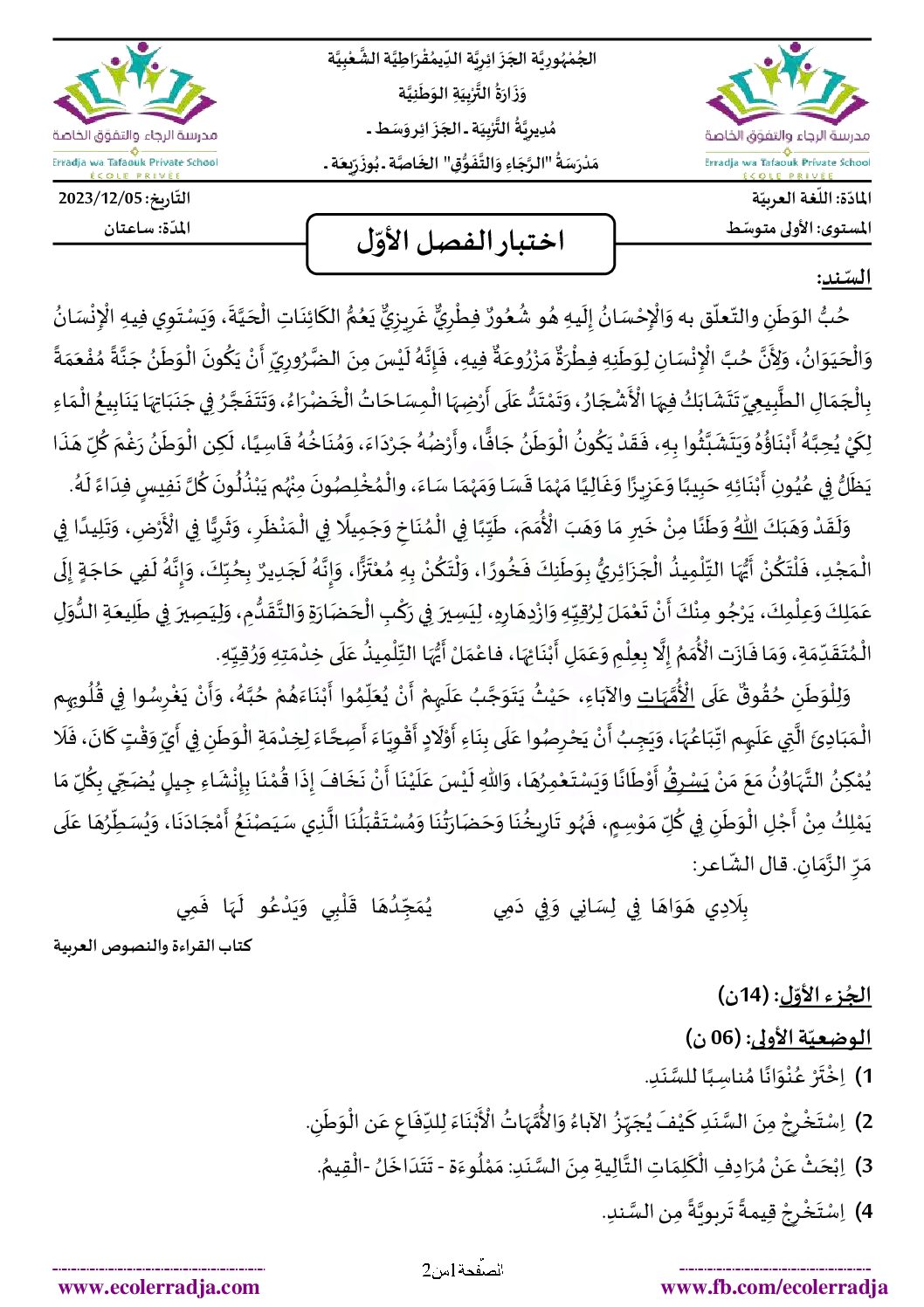 مادة اللغة العربية للسنة الأولى 1 متوسط دروس مفصلة، فروض واختبارات، تمارين محلولة: نموذج لإمتحان في الفصل الأول رقم 58- في مادة اللغة العربية مستوى السنة الأولى متوسط الجيل الثاني ، السنة الدراسية: 2025/2026 مع التصحيح