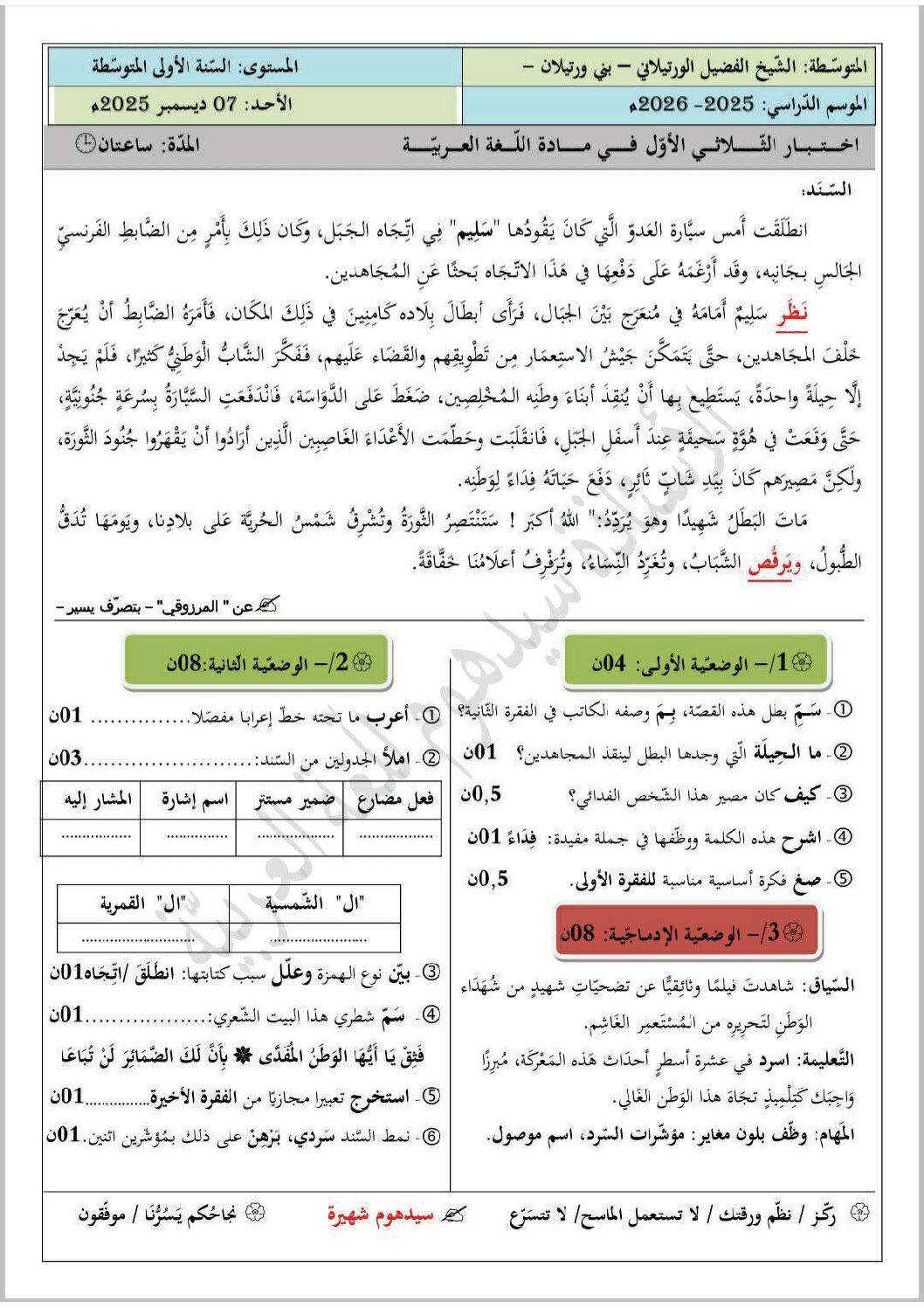 مادة اللغة العربية للسنة الأولى 1 متوسط دروس مفصلة، فروض واختبارات، تمارين محلولة: نموذج لإمتحان في الفصل الأول رقم 74- في مادة اللغة العربية مستوى السنة الأولى متوسط الجيل الثاني ، السنة الدراسية: 2025/2026 مع التصحيح