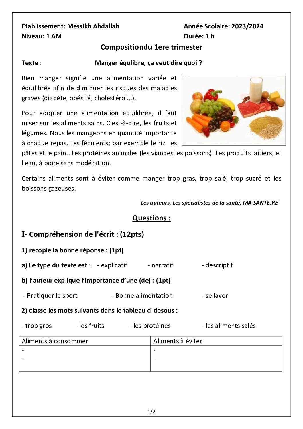 مادة اللغة الفرنسية للسنة الأولى 1 متوسط دروس مفصلة، فروض واختبارات، تمارين محلولة: نموذج لإمتحان في الفصل الأول رقم 54- في مادة اللغة الفرنسية مستوى السنة الأولى متوسط الجيل الثاني ، السنة الدراسية: 2025/2026 مع التصحيح