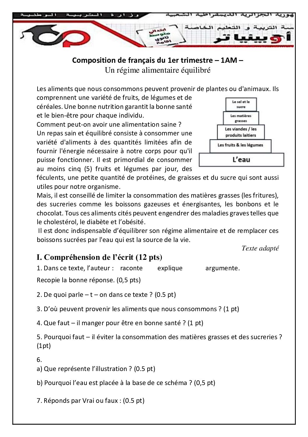 اختبار في اللغة الفرنسية الفصل الأول السنة الأولى متوسط رقم 57 مع التصحيح