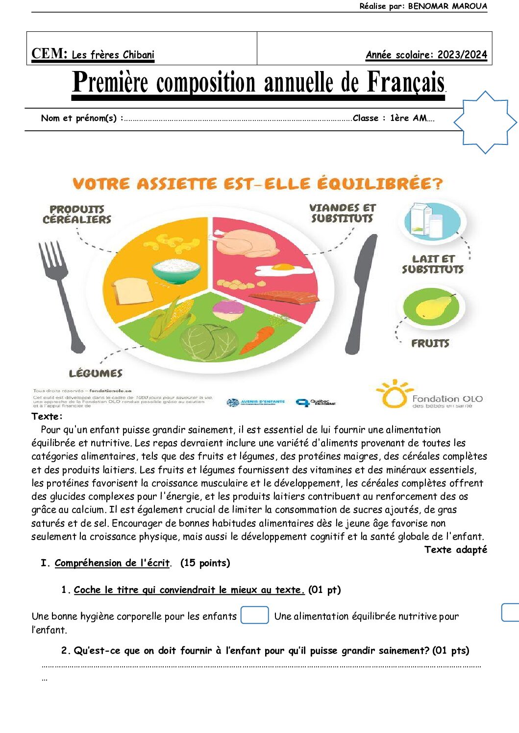 اختبار في اللغة الفرنسية الفصل الأول السنة الأولى متوسط رقم 59 مع التصحيح