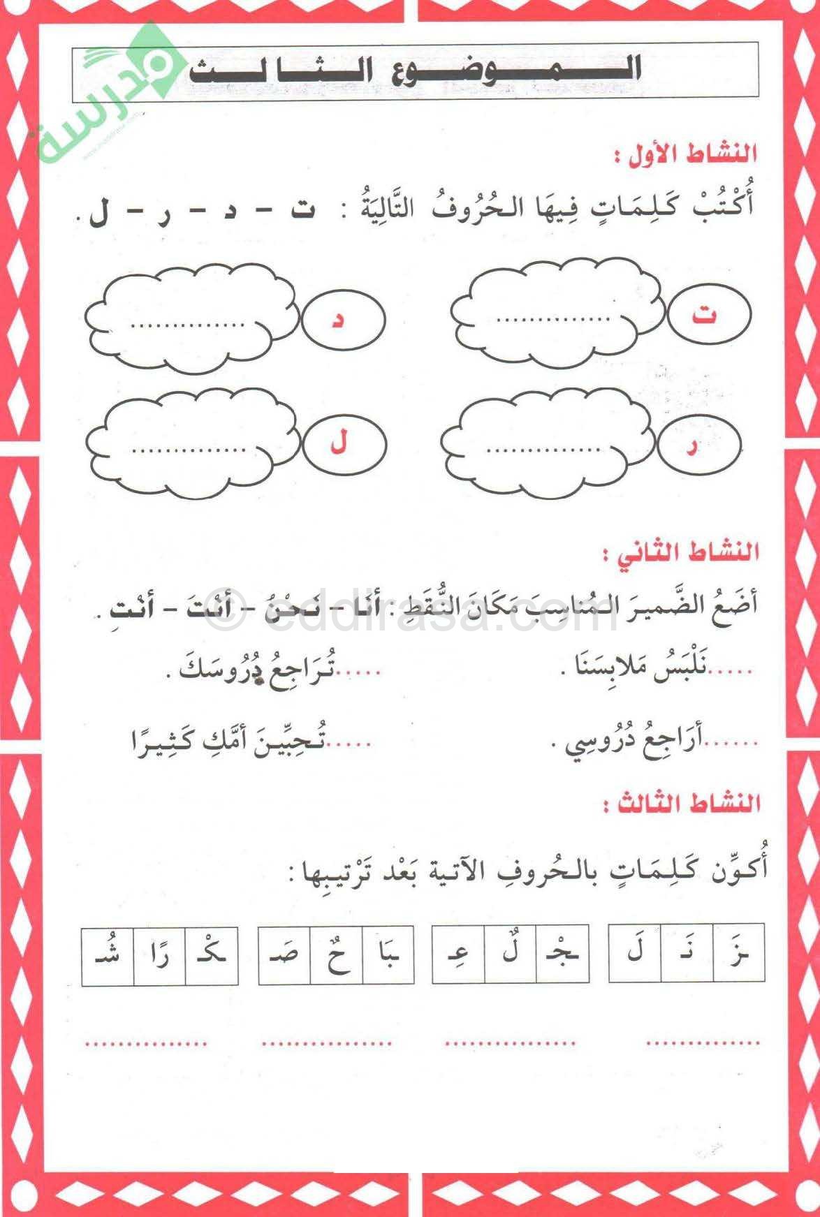 مادة : اللغة العربية للسنة الأولى ابتدائي : دروس مفصلة ، فروض واختبارات، تمارين محلولة: . الموضوع 03 – تمارين لغة عربية محلولة 1 ابتدائي الجيل الثاني