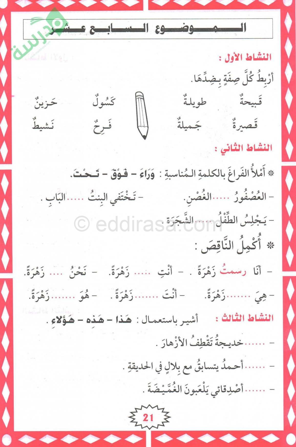 مادة : اللغة العربية للسنة الأولى ابتدائي : دروس مفصلة ، فروض واختبارات، تمارين محلولة: . الموضوع 17 – تمارين لغة عربية محلولة 1 ابتدائي الجيل الثاني