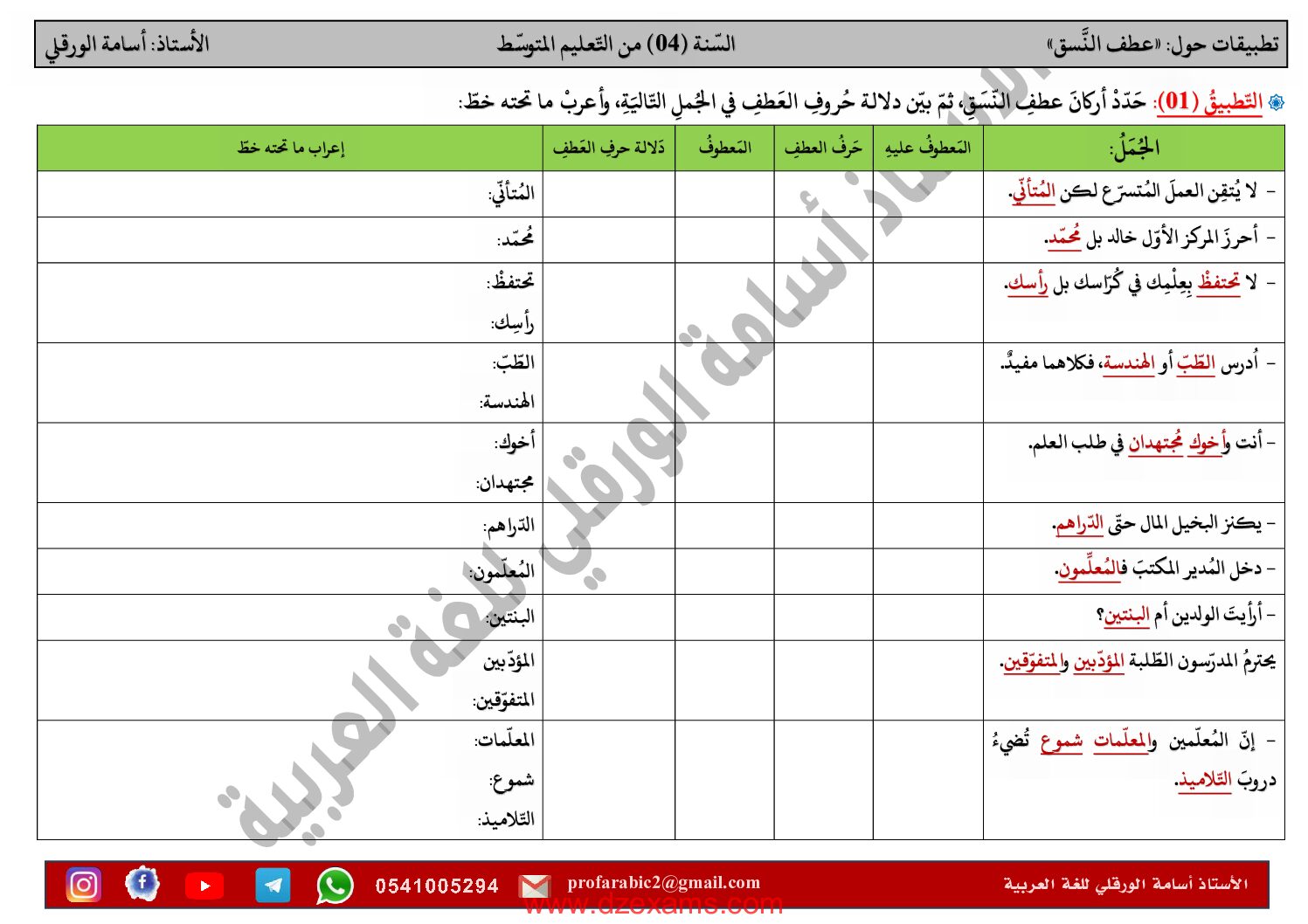 تدريبات لغوية حول عطف النسق للأستاذ أسامة الورقلي 4 متوسط 6 مواضيع مع الحل في اللغة العربية مقترحة لشهادة التعليم المتوسط 4 متوسط استراتيجية الاجابة عن أسئلة مادة اللغة العربية 4 متوسط مادة اللغة العربية للسنة الرابعة 4 متوسط دروس مفصلة، فروض واختبارات، تمارين محلولة