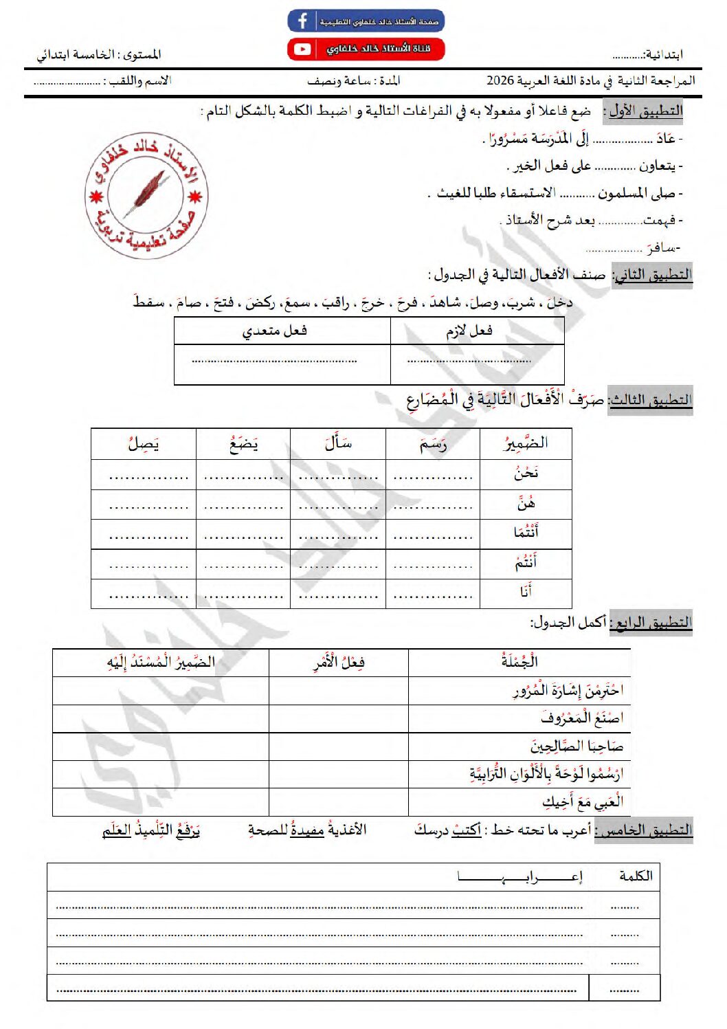 مادة اللغة العربية للسنة الخامسة 5 ابتدائي دروس مفصلة ، فروض واختبارات، تمارين محلولة: نموذج لإمتحان تقويم تشخيصي رقم 13- في مادة اللغة العربية مستوى السنة الخامسة ابتدائي الجيل الثاني ، السنة الدراسية: 2025/2026 مع التصحيح