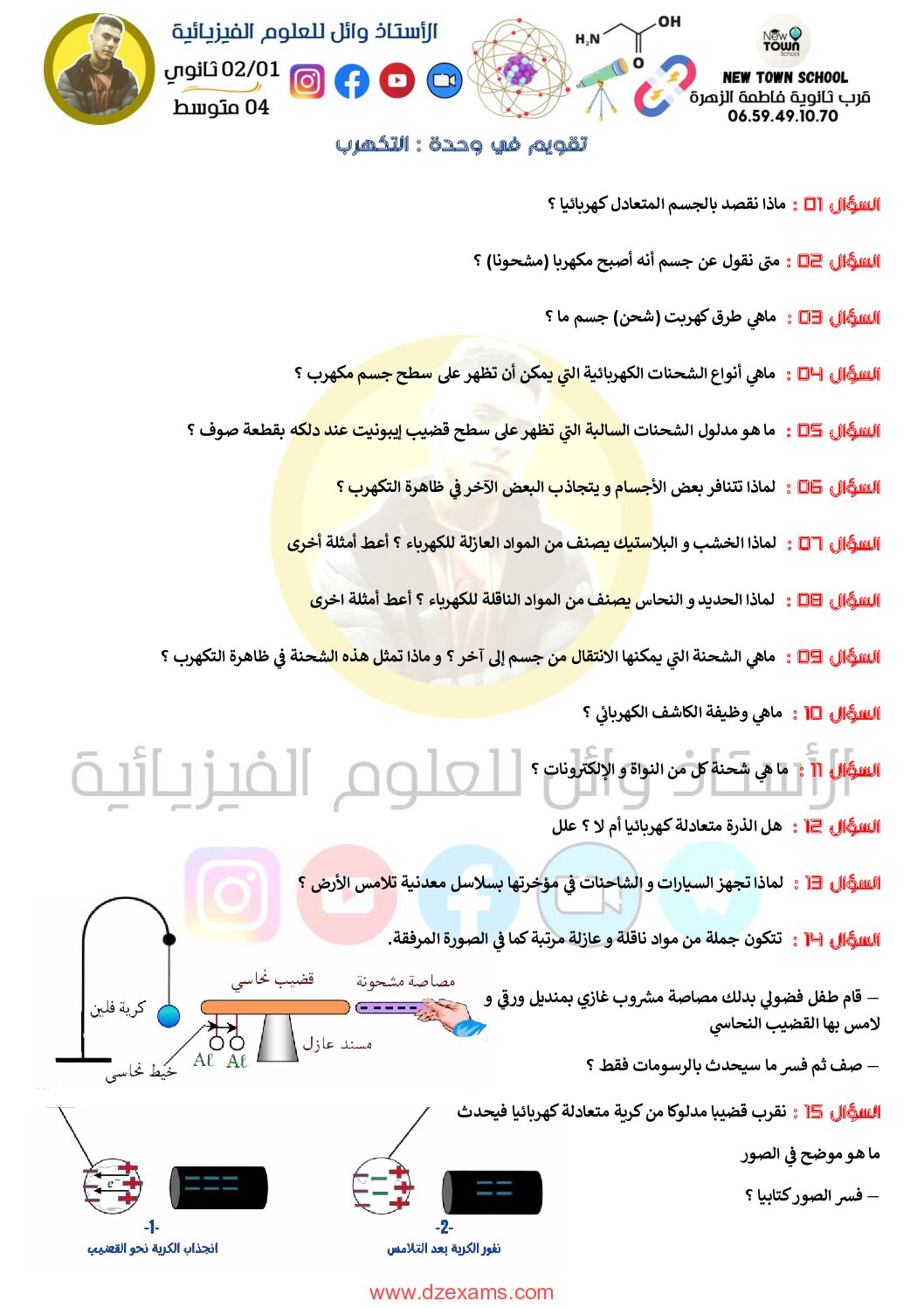 تقويم في وحدة التكهرب للأستاذ وائل 4 متوسط مادة العلوم الفيزيائية للسنة الرابعة 4 متوسط دروس مفصلة، فروض واختبارات، تمارين محلولة: 17 تمرين حول الكهرباء الساكنة في العلوم الفيزيائية 4 متوسط ، تحضير شهادة التعليم المتوسط