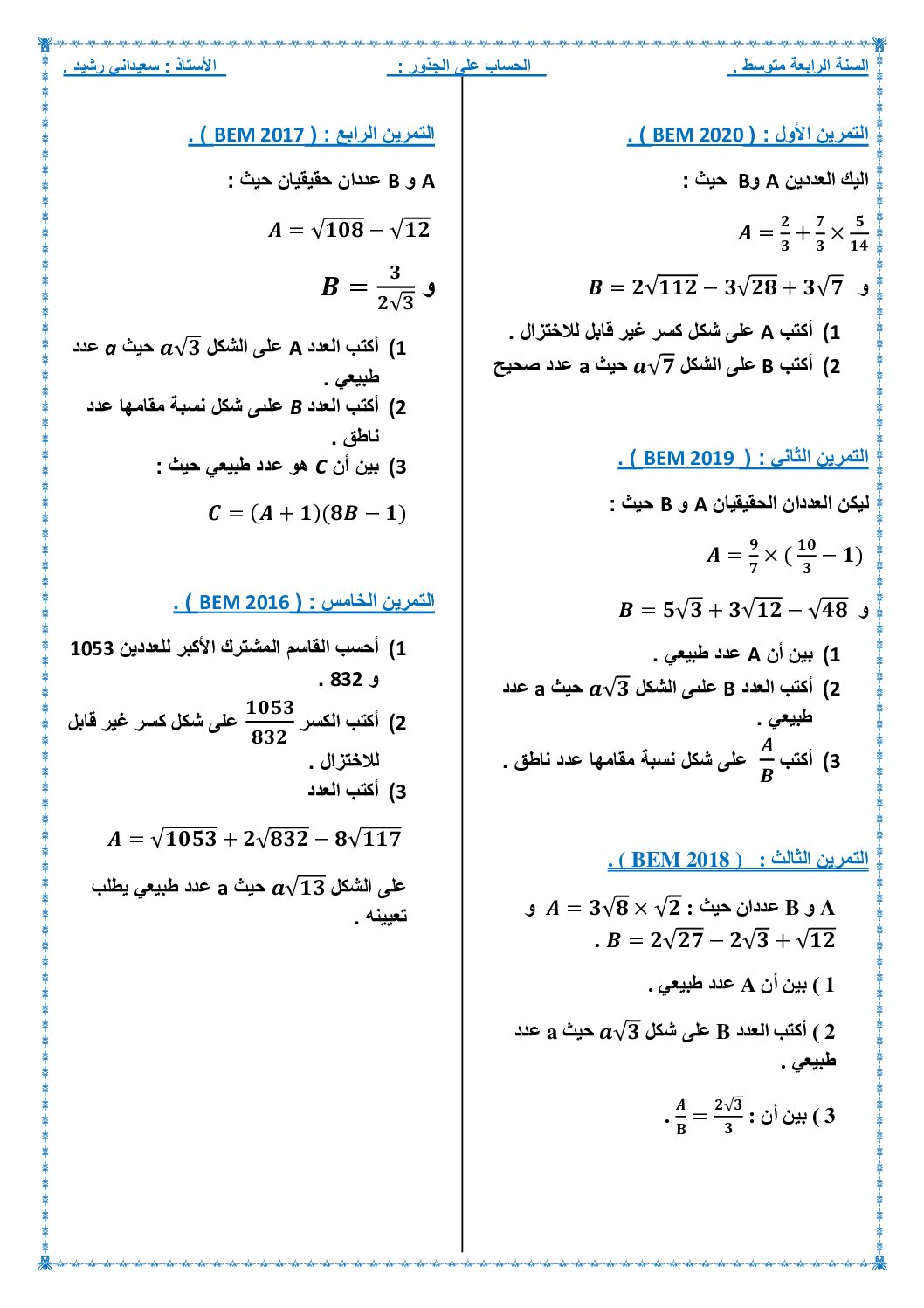 تمارين الحساب على الجذور في مادة الرياضيات 4 متوسط 14 سؤال و جواب حول الدالة الخطية و الدالة التالفية في الرياضيات 4 متوسط : سلاسل تمارين وتطبيقات محلولة في الرياضيات سنة رابعة متوسط maths 4AM: ملفات تعليمية في مادة الرياضيات لتحضير شهادة التعليم المتوسط