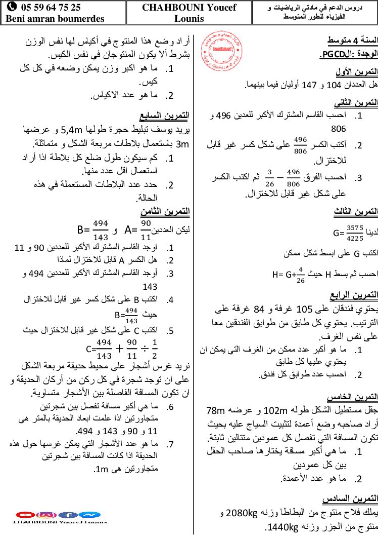 تمارين حول القاسم المشترك الأكبر إعداد الأستاذ شهبوني يوسف لونيس 4 متوسط 14 سؤال و جواب حول الدالة الخطية و الدالة التالفية في الرياضيات 4 متوسط : سلاسل تمارين وتطبيقات محلولة في الرياضيات سنة رابعة متوسط maths 4AM: ملفات تعليمية في مادة الرياضيات لتحضير شهادة التعليم المتوسط