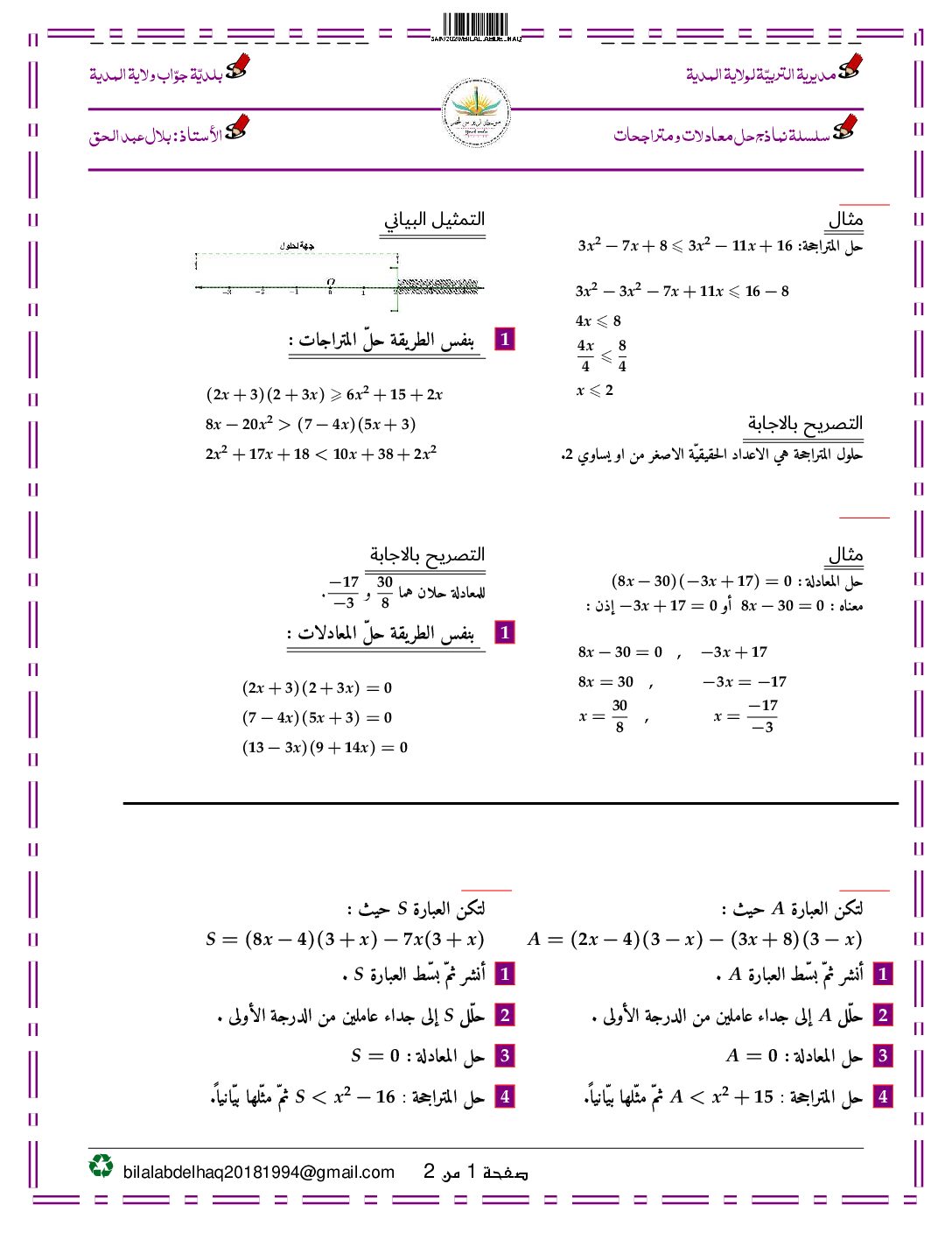 تمارين حول المعادلات والمتراجحات إعداد الأستاذ بلال عبد الحق 4 متوسط 14 سؤال و جواب حول الدالة الخطية و الدالة التالفية في الرياضيات 4 متوسط : سلاسل تمارين وتطبيقات محلولة في الرياضيات سنة رابعة متوسط maths 4AM: ملفات تعليمية في مادة الرياضيات لتحضير شهادة التعليم المتوسط
