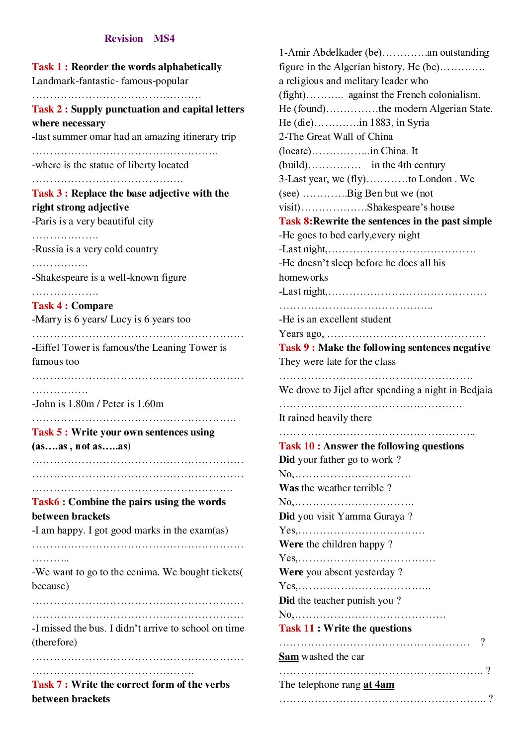 تمارين للمراجعة في مادة اللغة الانجليزية 4 متوسط 25 تمرين في مادة اللغة الانجليزية 4 متوسط Diagnostic test 4MS مادة اللغة الإنجليزية للسنة الرابعة 4 متوسط دروس مفصلة، فروض واختبارات، تمارين محلولة: مستوى السنة الرابعة متوسط لتحضير شهادة التعليم المتوسط