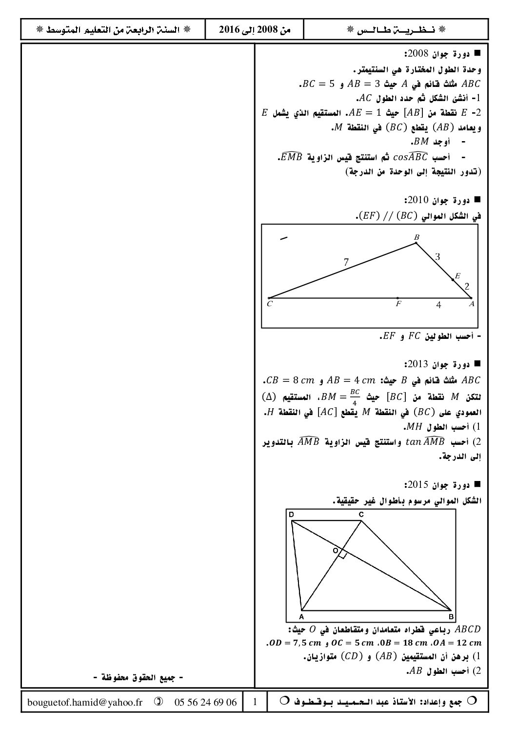 تمارين نظرية طاليس في شهادة التعليم المتوسط من 2008 إلى 2016 4 متوسط