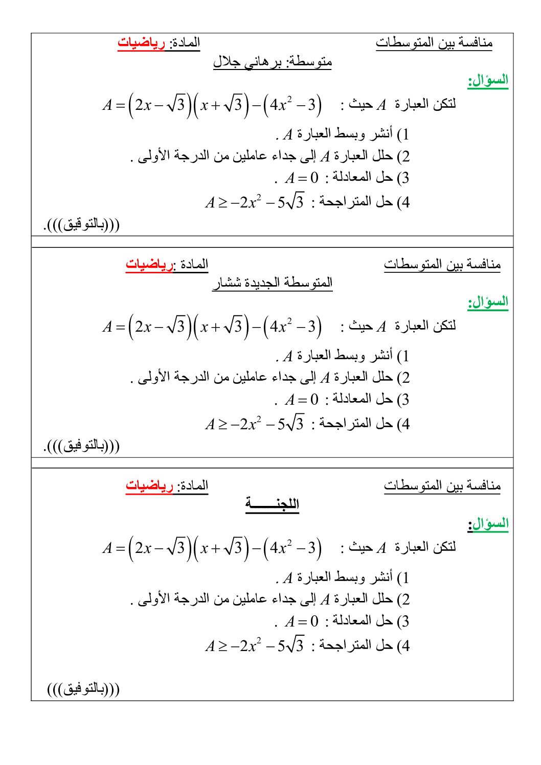 تمرين المنافسة بن المتوسطات مع التصحيح في الرياضيات 4 متوسط 14 سؤال و جواب حول الدالة الخطية و الدالة التالفية في الرياضيات 4 متوسط : سلاسل تمارين وتطبيقات محلولة في الرياضيات سنة رابعة متوسط maths 4AM: ملفات تعليمية في مادة الرياضيات لتحضير شهادة التعليم المتوسط