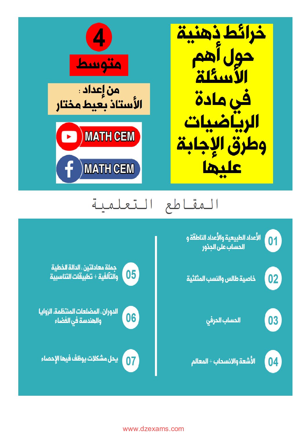 خرائط ذهنية حول أهم الاسئلة في الرياضيات وطرق الاجابة عليها للاستاذ بعيط مختار 4 متوسط