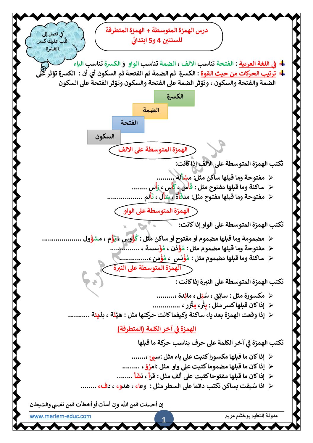 درس الهمزة المتوسطة الهمزة المتطرفة للأستاذة مريم بوخشم 5 ابتدائي مادة اللغة العربية للسنة الخامسة 5 ابتدائي دروس مفصلة ، فروض واختبارات، تمارين محلولة: تقويم تشخيصي في اللغة العربية سنة خامسة ابتدائي