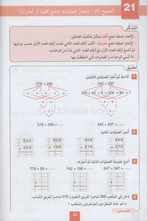 مادة : الرياضيات للسنة الثانية ابتدائي : دروس مفصلة ، فروض واختبارات، تمارين محلولة: دروس مادة الرياضيات للسنة الثانية من التعليم الإبتدائي الجيل الثاني. دروس الرياضيات – إنجاز عمليات جمع أفقيا أو عموديا – 3