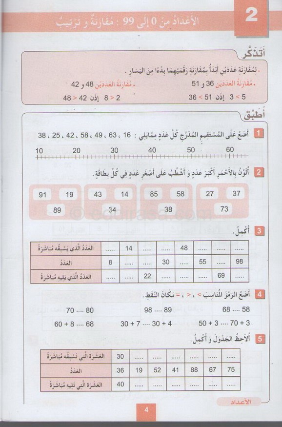 مادة : الرياضيات للسنة الثانية ابتدائي : دروس مفصلة ، فروض واختبارات، تمارين محلولة: دروس مادة الرياضيات للسنة الثانية من التعليم الإبتدائي الجيل الثاني. دروس الرياضيات – الأعداد من 0 إلى 99 – مقارنة و ترتيب