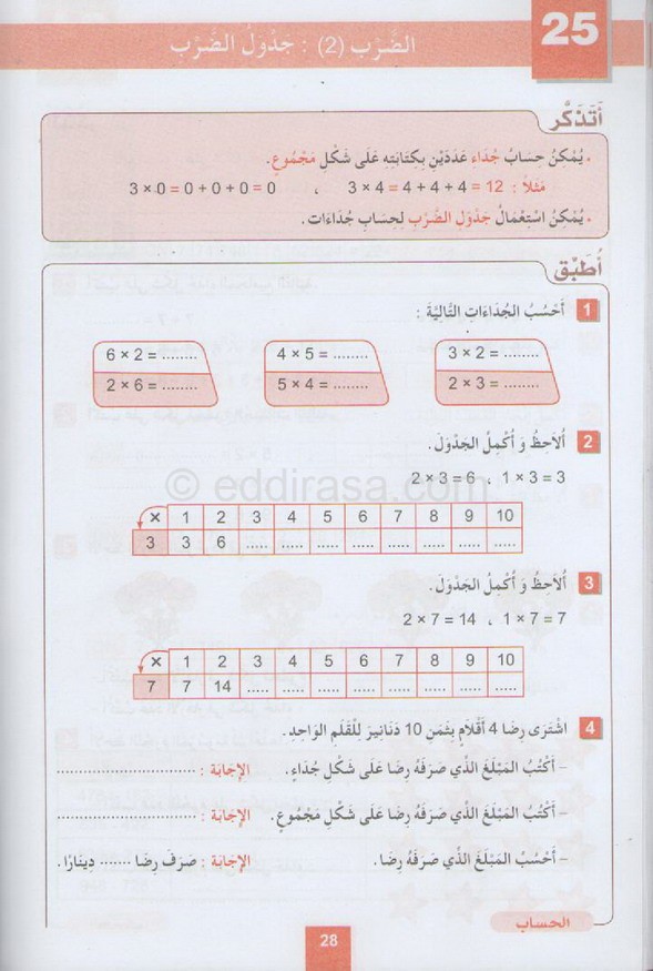 مادة : الرياضيات للسنة الثانية ابتدائي : دروس مفصلة ، فروض واختبارات، تمارين محلولة: دروس مادة الرياضيات للسنة الثانية من التعليم الإبتدائي الجيل الثاني. دروس الرياضيات – جدول الضرب