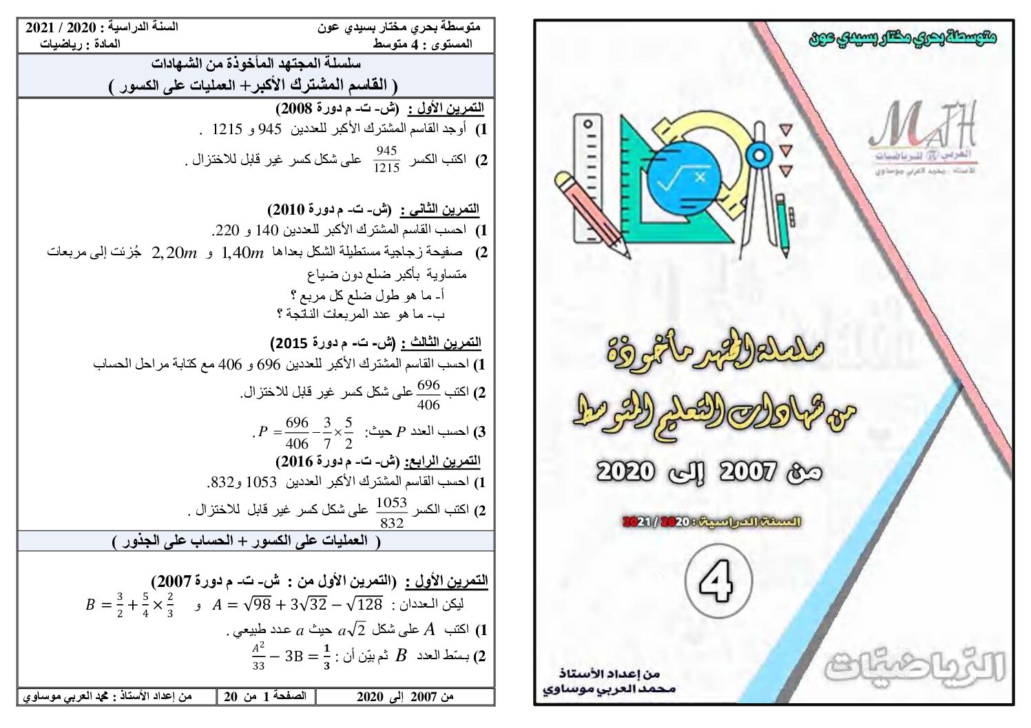 سلسلة المجتهد في الرياضيات تمارين شهادة التعليم المتوسط مرتبة حسب المقاطع 4 متوسط 14 سؤال و جواب حول الدالة الخطية و الدالة التالفية في الرياضيات 4 متوسط : سلاسل تمارين وتطبيقات محلولة في الرياضيات سنة رابعة متوسط maths 4AM: ملفات تعليمية في مادة الرياضيات لتحضير شهادة التعليم المتوسط