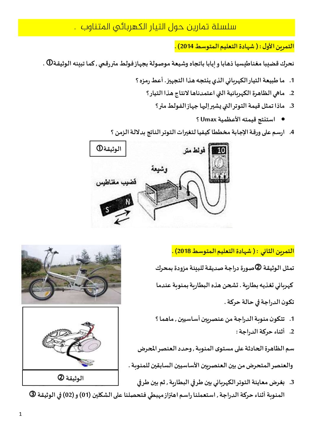 سلسلة تمارين حول التيار الكهربائي المتناوب مع الحلول في مادة الفيزياء 4 متوسط مادة العلوم الفيزيائية للسنة الرابعة 4 متوسط دروس مفصلة، فروض واختبارات، تمارين محلولة: 17 تمرين حول الكهرباء الساكنة في العلوم الفيزيائية 4 متوسط ، تحضير شهادة التعليم المتوسط