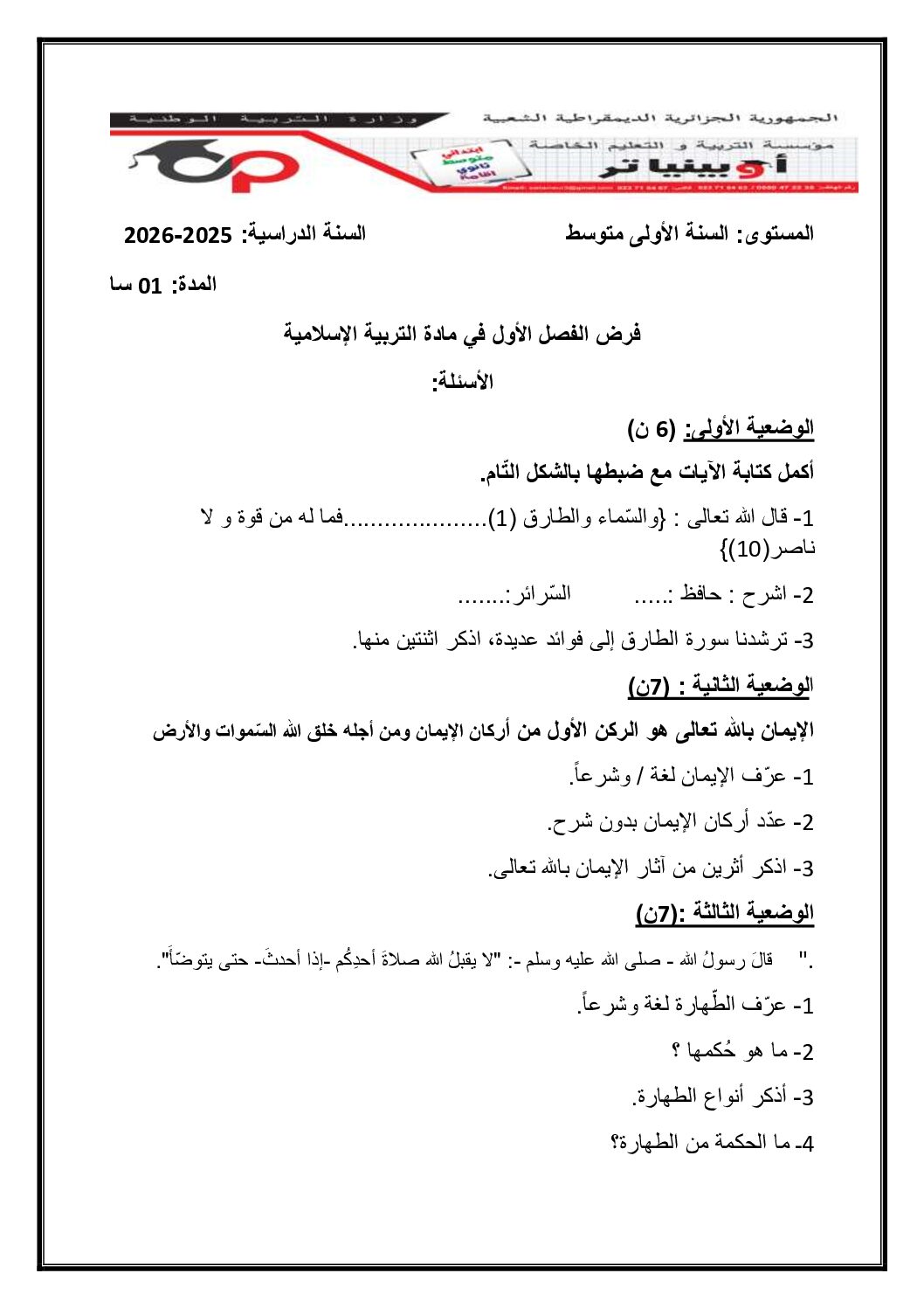 مادة التربية الإسلامية للسنة الأولى 1 متوسط دروس مفصلة، فروض واختبارات، تمارين محلولة: نموذج لإمتحان في الفصل الأول رقم 30- في مادة التربية الإسلامية مستوى السنة الأولى متوسط الجيل الثاني ، السنة الدراسية: 2025/2026 مع التصحيح