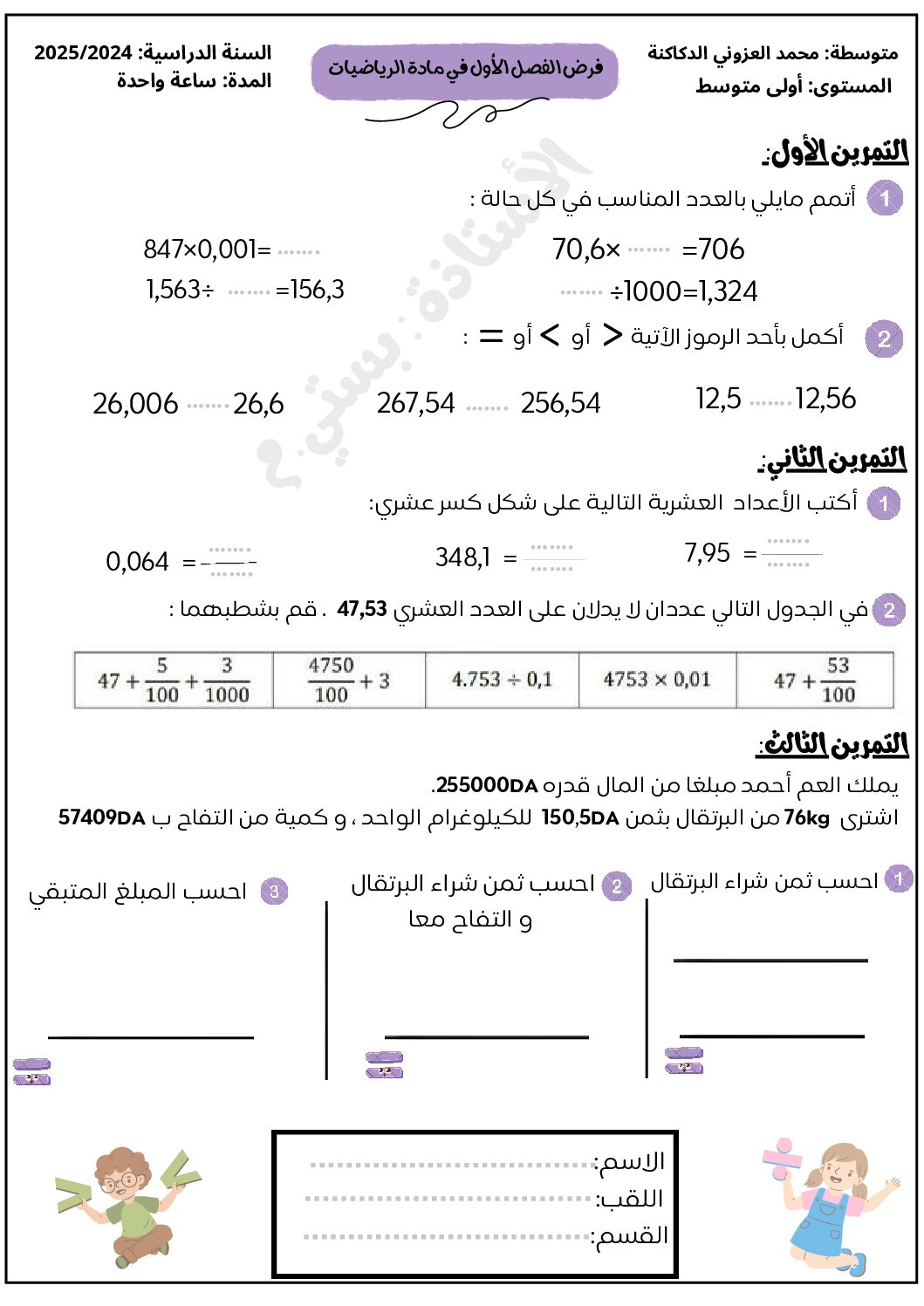 مادة التربية المدنية للسنة الأولى 1 متوسط دروس مفصلة، فروض واختبارات، تمارين محلولة: نموذج لإمتحان في الفصل الأول رقم 61- في مادة التربية المدنية مستوى السنة الأولى متوسط الجيل الثاني ، السنة الدراسية: 2025/2026 مع التصحيح