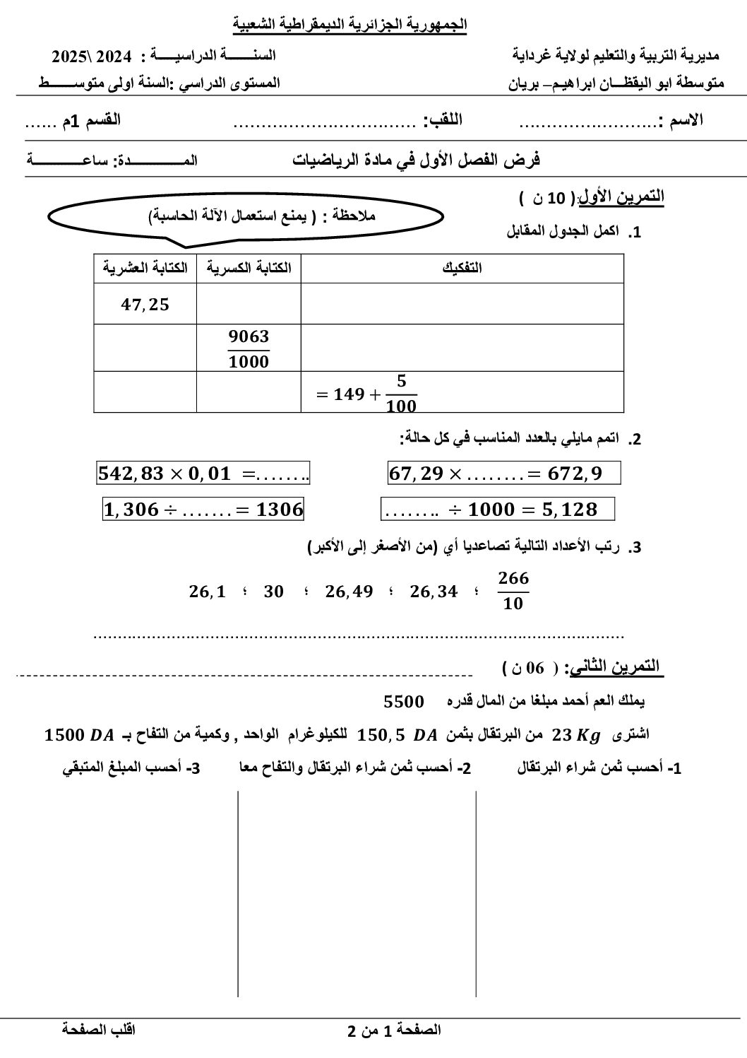مادة التربية المدنية للسنة الأولى 1 متوسط دروس مفصلة، فروض واختبارات، تمارين محلولة: نموذج لإمتحان في الفصل الأول رقم 63- في مادة التربية المدنية مستوى السنة الأولى متوسط الجيل الثاني ، السنة الدراسية: 2025/2026 مع التصحيح
