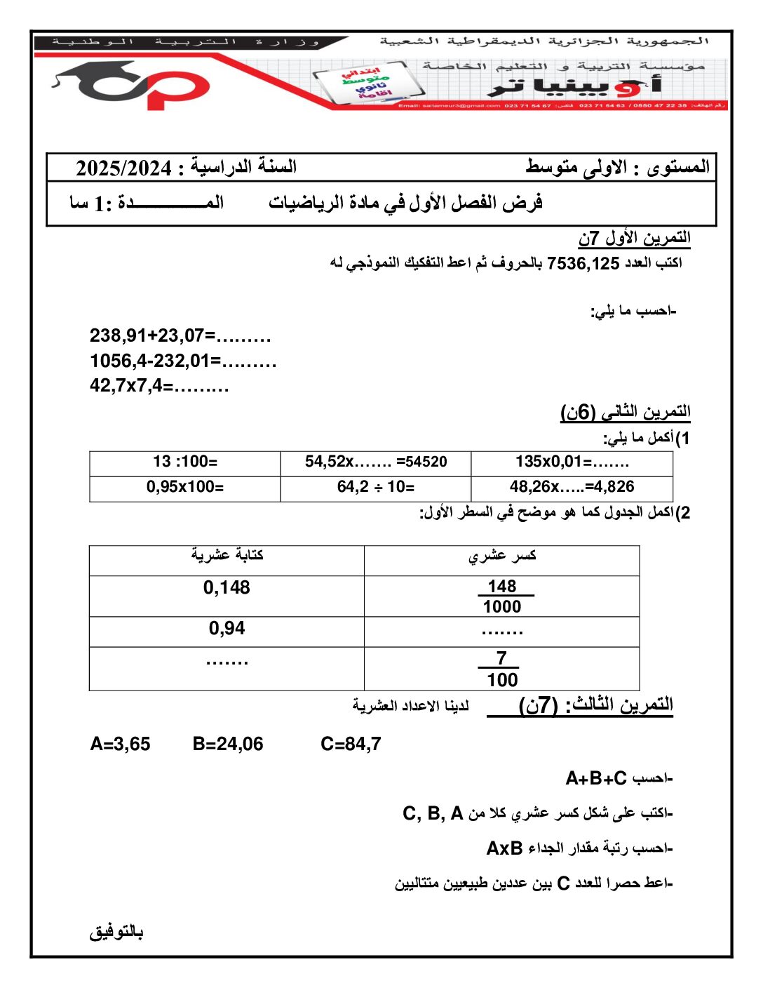 مادة التربية المدنية للسنة الأولى 1 متوسط دروس مفصلة، فروض واختبارات، تمارين محلولة: نموذج لإمتحان في الفصل الأول رقم 67- في مادة التربية المدنية مستوى السنة الأولى متوسط الجيل الثاني ، السنة الدراسية: 2025/2026 مع التصحيح