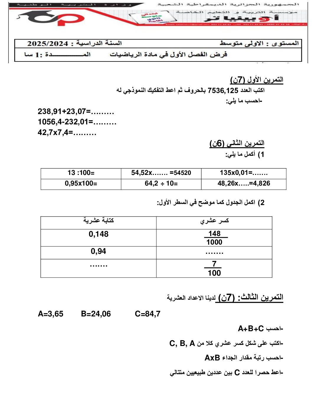 فرض في التربية المدنية الفصل الأول السنة الأولى متوسط رقم 68 مع التصحيح