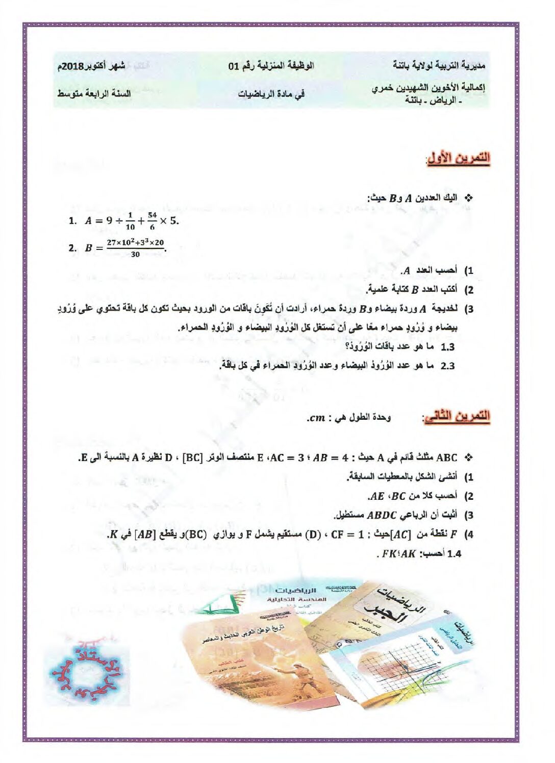 مادة الرياضيات للسنة الرابعة 4 متوسط دروس مفصلة، فروض واختبارات، تمارين محلولة: نموذج واجب منزلي رقم 1- في مادة الرياضيات مستوى السنة الرابعة متوسط الجيل الثاني ، السنة الدراسية: 2024/2025 مع التصحيح