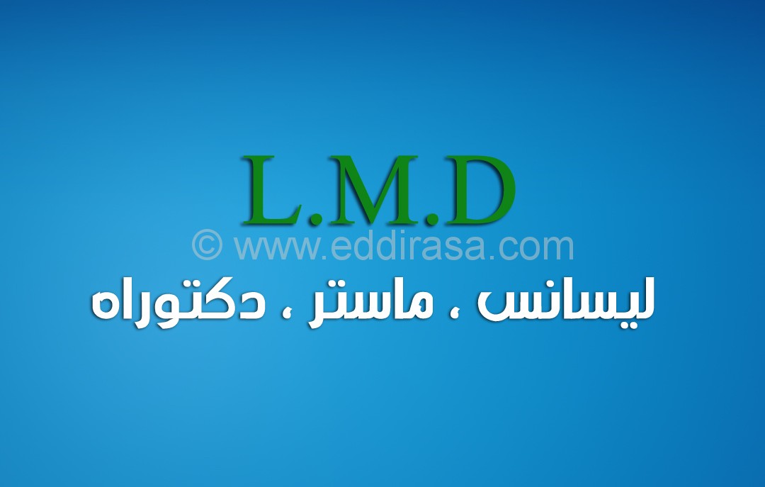 L.M.D. : نظام للتعليم العالي منظم في ثلاثة ( 03 ) أطوار: ليسانس، ماستر ودكتوراه. تتفرع التكوينات إلى ميادين و شعب وتختصصات . تدرس سداسيًا ومنظم في وحدات تعلمية، تكتسب و تحول.
