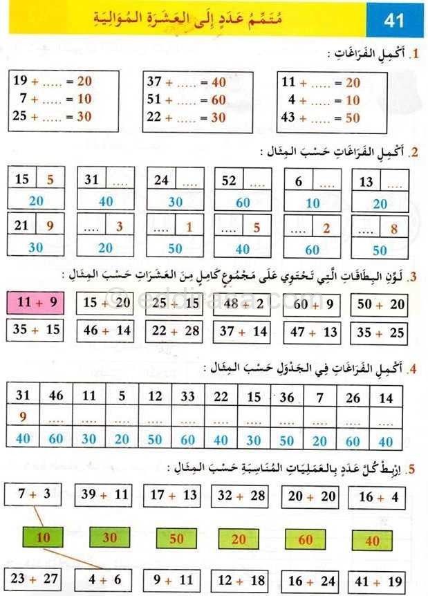 مادة : الرياضيات للسنة الأولى ابتدائي : دروس مفصلة ، فروض واختبارات، تمارين محلولة: . دروس الرياضيات – متمم عدد إلى العشرة الموالية