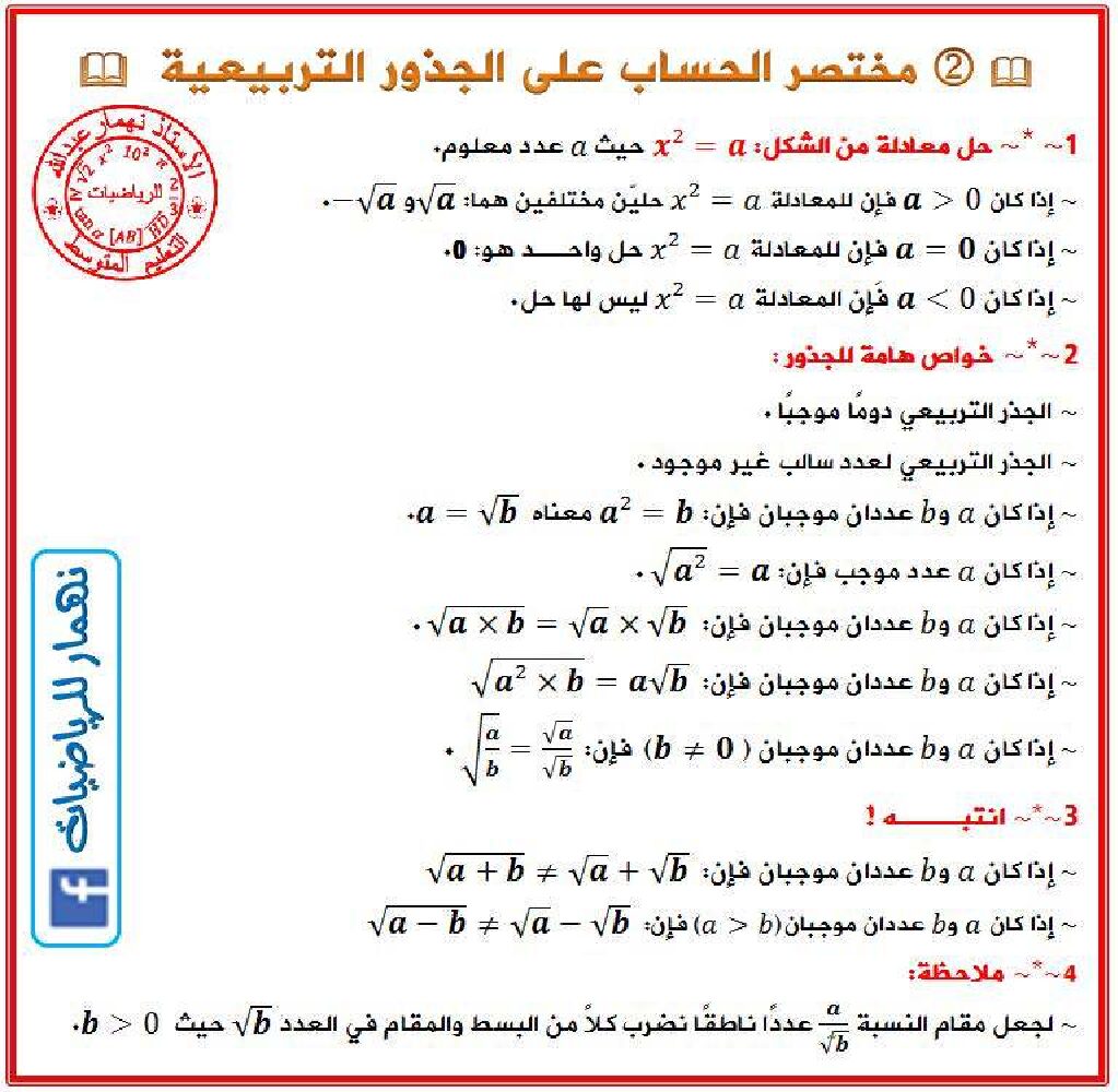 مختصر الحساب على الجذور التربيعية في الرياضيات 4 متوسط أهم الخواص التي تساعد على البرهان في الهندسة 4 متوسط مادة الرياضيات للسنة الرابعة 4 متوسط : ملخص لدروس الرياضيات سنة رابعة متوسط maths 4AM: ملفات تعليمية في مادة الرياضيات لتحضير شهادة التعليم المتوسط