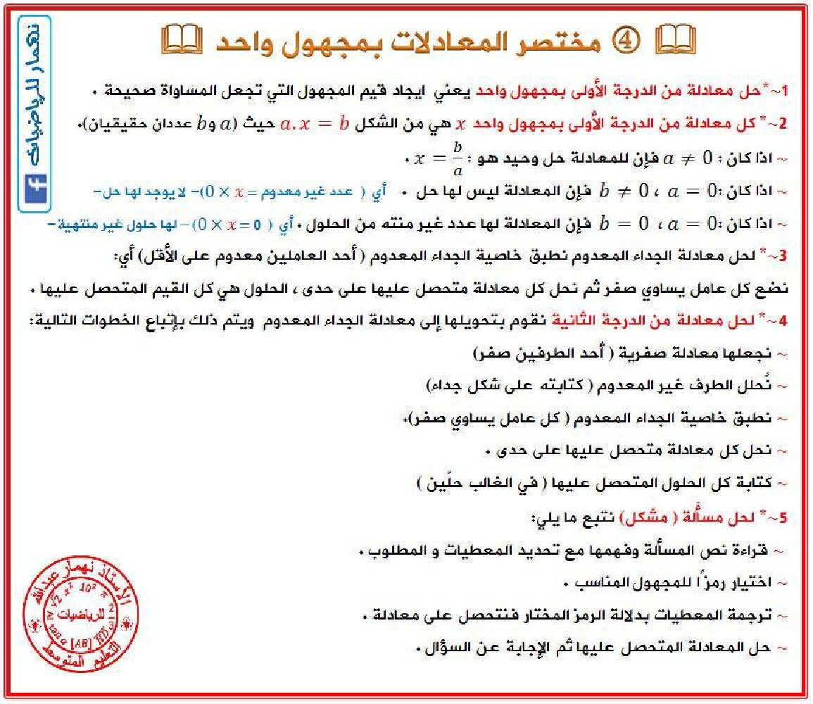مختصر المعادلات بمجهول واحد في مادة الرياضيات 4 متوسط أهم الخواص التي تساعد على البرهان في الهندسة 4 متوسط مادة الرياضيات للسنة الرابعة 4 متوسط : ملخص لدروس الرياضيات سنة رابعة متوسط maths 4AM: ملفات تعليمية في مادة الرياضيات لتحضير شهادة التعليم المتوسط