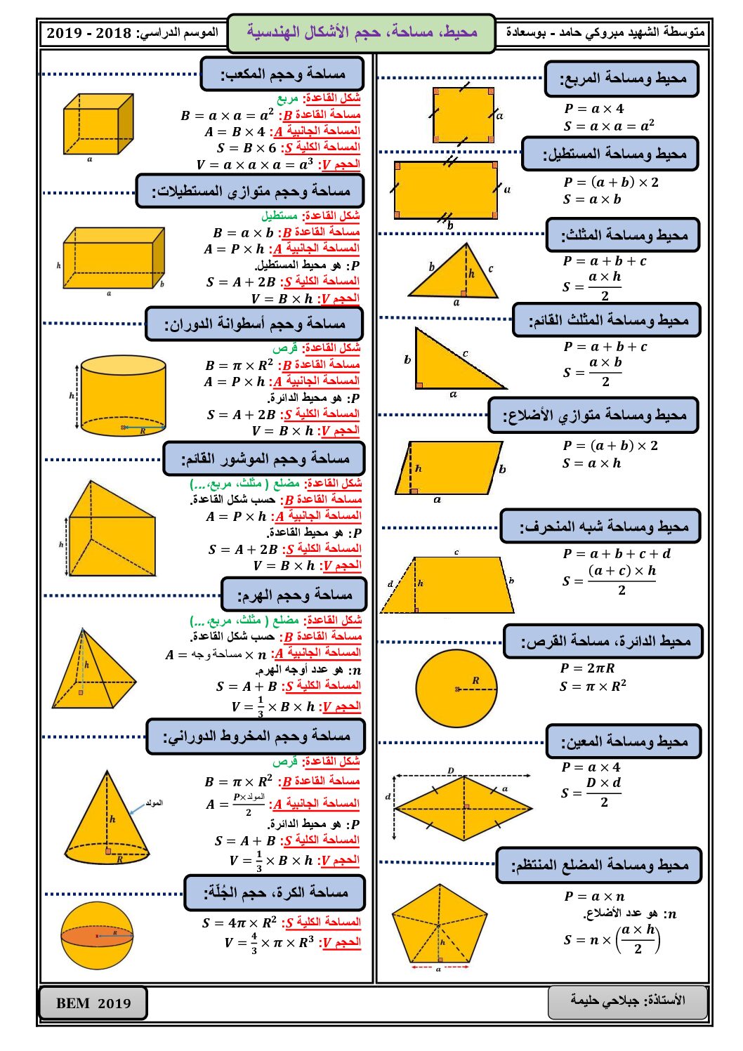 مختصر قواعد المحيط المساحة والحجم في الرياضيات 4 متوسط أهم الخواص التي تساعد على البرهان في الهندسة 4 متوسط مادة الرياضيات للسنة الرابعة 4 متوسط : ملخص لدروس الرياضيات سنة رابعة متوسط maths 4AM: ملفات تعليمية في مادة الرياضيات لتحضير شهادة التعليم المتوسط
