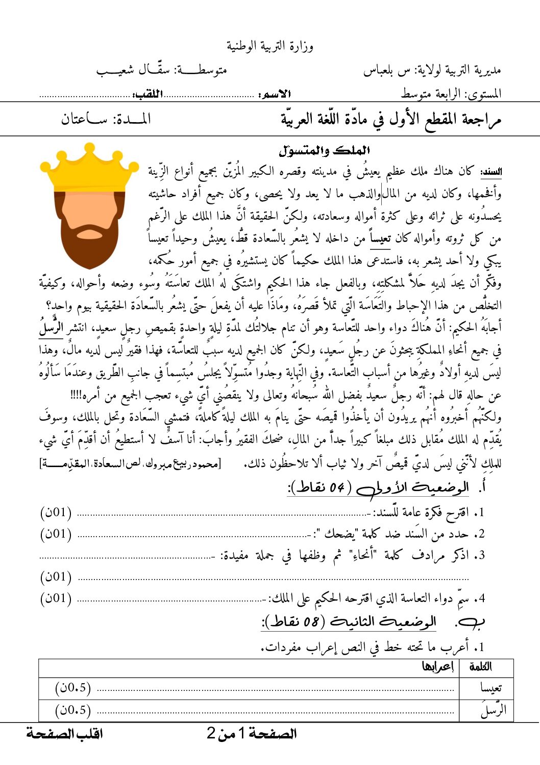 مراجعة المقطع الأول مع التصحيح في مادة اللغة العربية 4 متوسط
