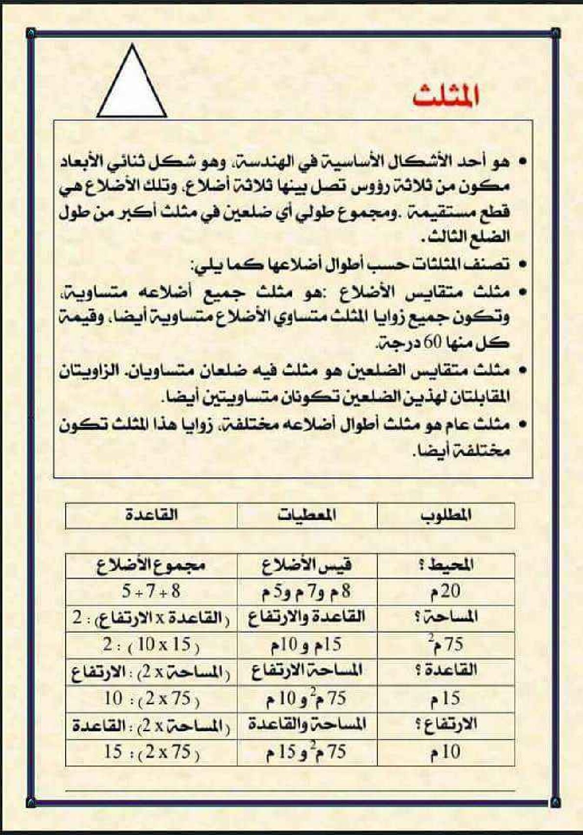 مراجعة درس المثلث في الرياضيات 5 ابتدائي مادة الرياضيات للسنة الخامسة 5 ابتدائي دروس مفصلة ، فروض واختبارات، تمارين محلولة: ملخص دروس الرياضيات للسنة الخامسة ابتدائي