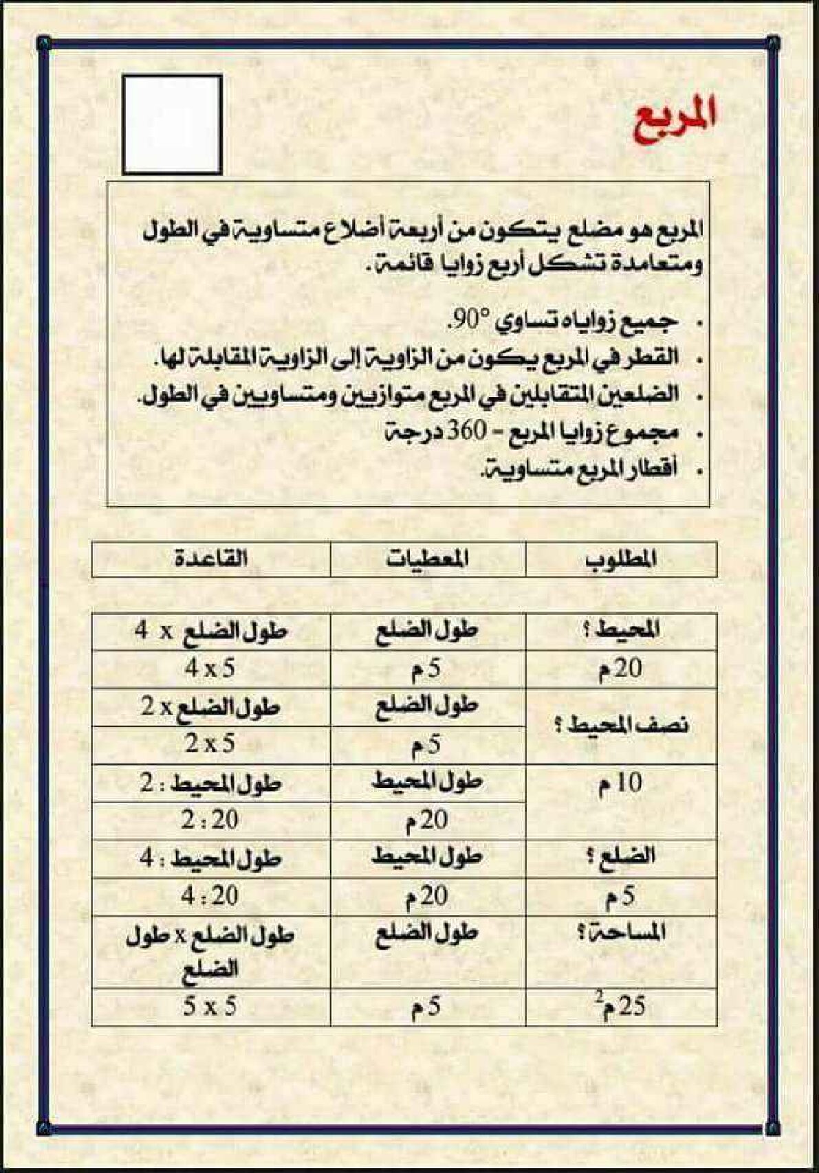 مراجعة درس المربع في الرياضيات 5 ابتدائي مادة الرياضيات للسنة الخامسة 5 ابتدائي دروس مفصلة ، فروض واختبارات، تمارين محلولة: ملخص دروس الرياضيات للسنة الخامسة ابتدائي